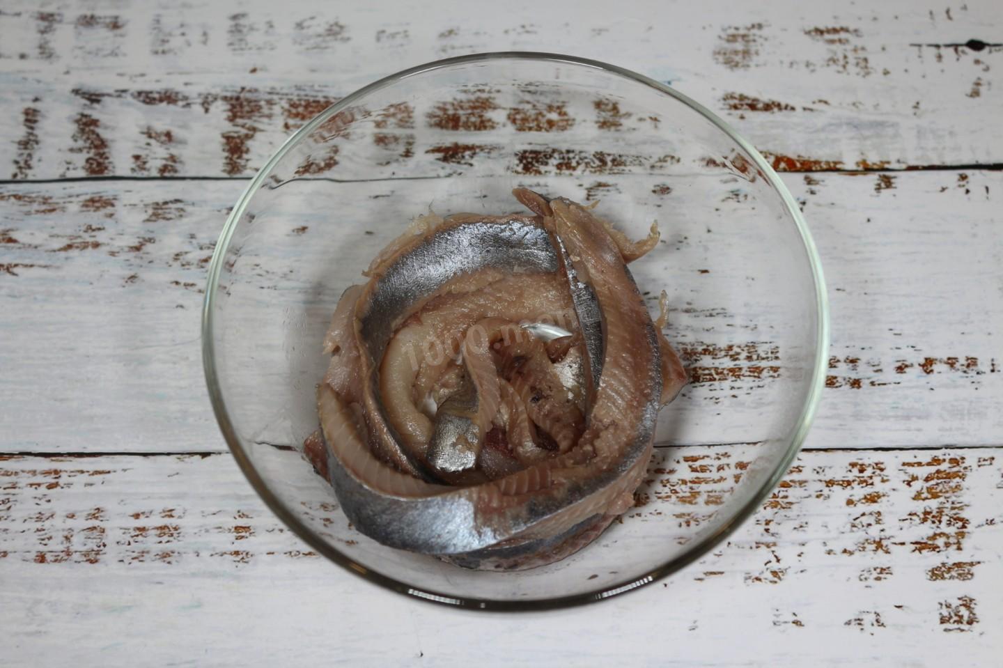Селедку разделайте на филе, отрезав хвост, плавники и удалив кожицу и косточки. Уже подготовленное филе разрежьте на длинные полоски, вдоль всего филейного кусочка сельди. При желании можете взять готовое филе сельди. Отставьте филе в сторонку, вернемся к нему позже.