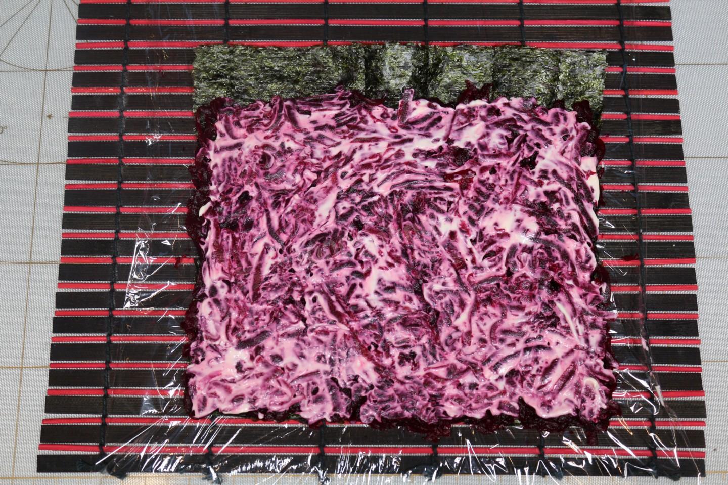 Пришло время к самому главному – формированию самих роллов. Положите лист нори на циновку гладкой стороной вниз, шероховатой стороной вверх. Выложите часть свеклы на лист нори (примерно 3 мм.), разровняйте ее таким образом, чтобы по длинному краю осталось пустое место (без свеклы) шириной в 1 см. Слой свеклы промажьте тонким слоем майонеза.