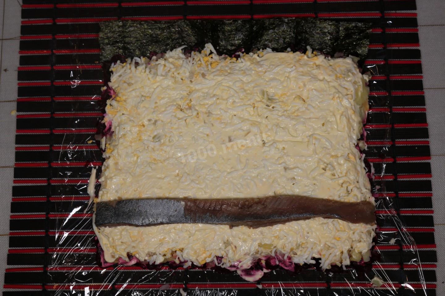 Филе сельди выложите вдоль длинного края нори, закрытого свеклой, отступив приблизительно 0,5 см. Теперь при помощи циновки сверните ролл, прижимая и придавая ему форму при каждом повороте.