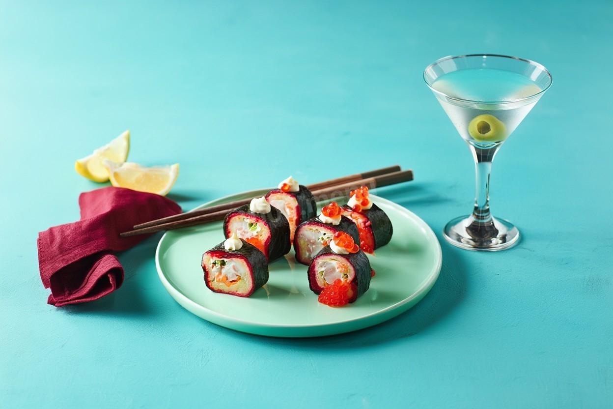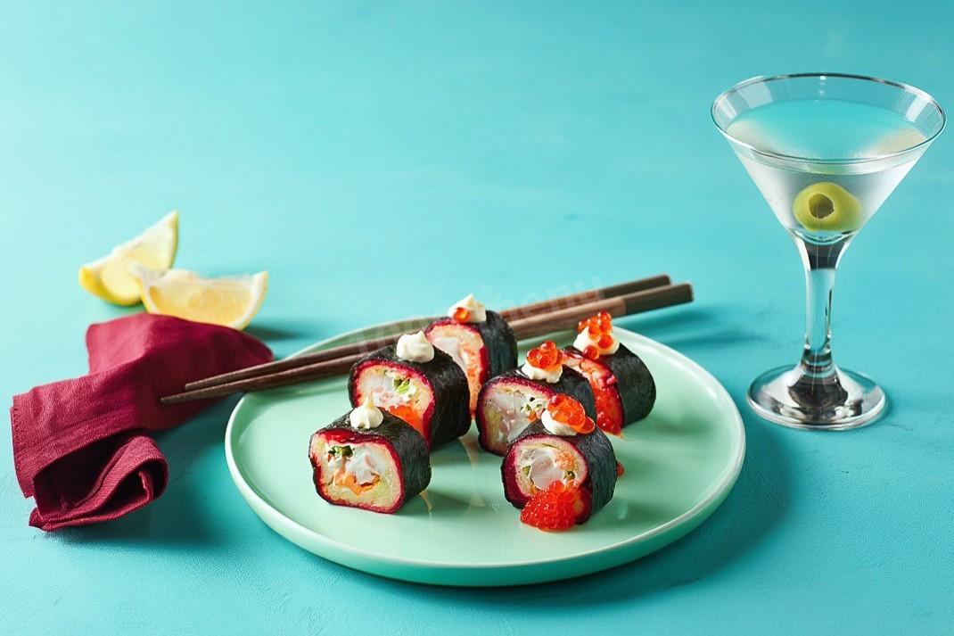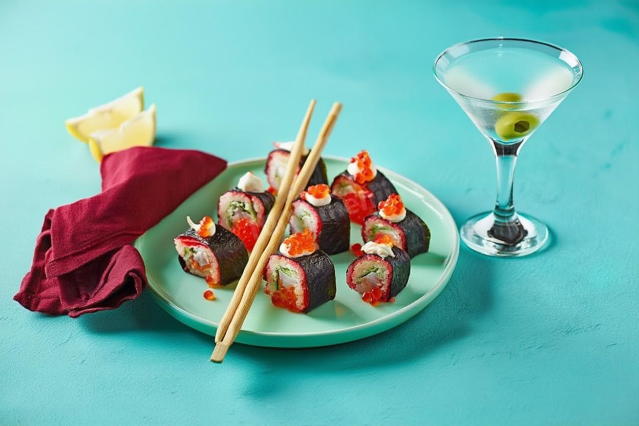 Готовый ролл разрежьте острым ножом на порционные кусочки (3 см. - 4 см.). Нож необходимо каждый раз окунать в горячую воду. Проделывайте такую же процедуру с оставшимися продуктами. Когда все роллы будут готовы, украсьте роллы на ваше усмотрение. Подавайте роллы с оставшимся майонезом.