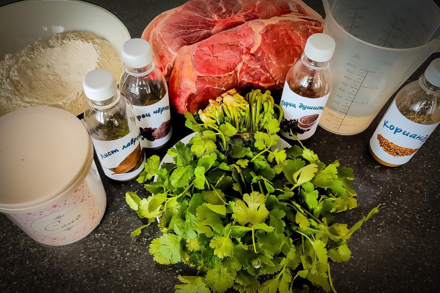 Для приготовления хинкали нам понадобится не так уж и много продуктов. Намного важнее, чтоб всё было свежее. Если Вам не нравится кинза (я ранее терпеть её не мог), то её можно заменить на петрушку. Когда все ингредиенты готовы, то можно приступать.
