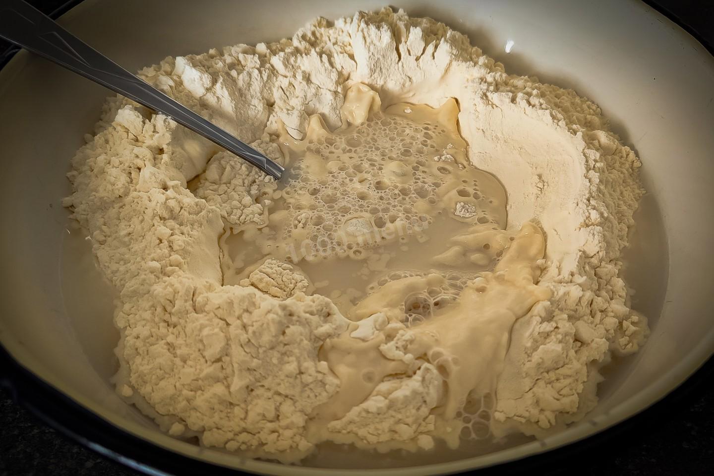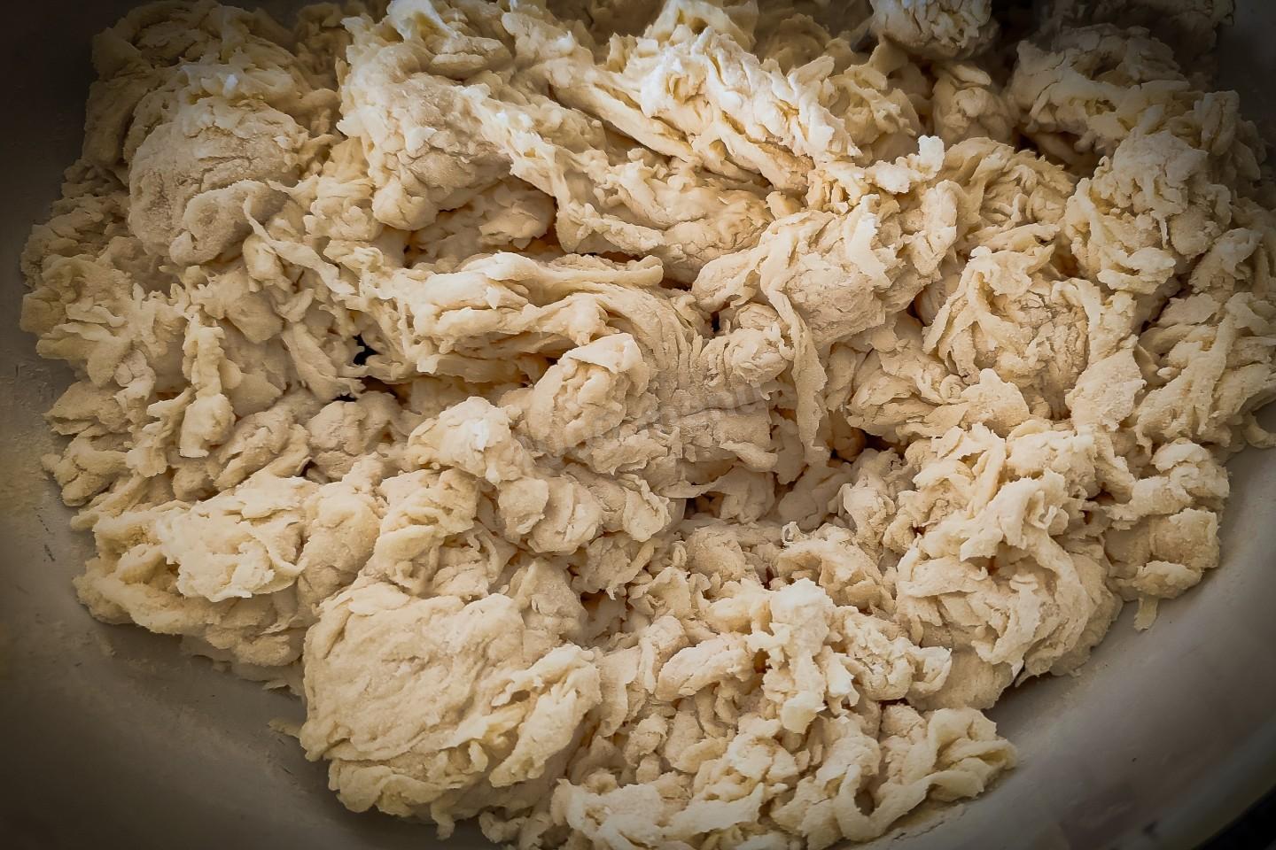 В итог получится практически рассыпчатое тесто, в которой нет лишней жидкости и муки. Теперь можно начать замешивать тесто руками.