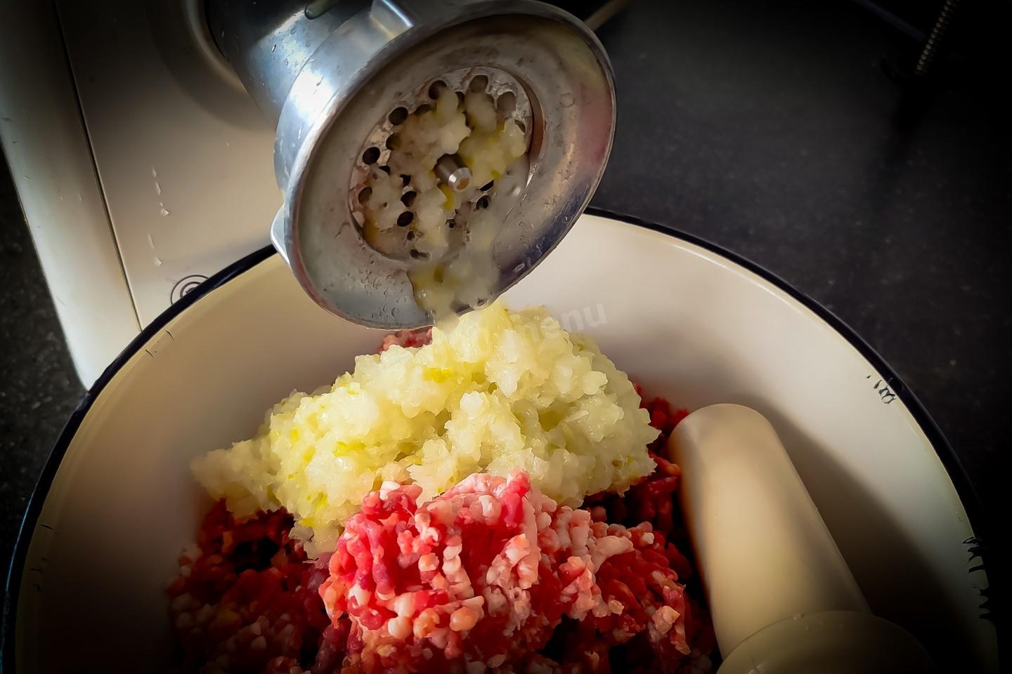 Пока тесто "отдыхает", мы будет готовить начинку. На мясорубке через среднюю насадку перемолоть мясо и лук. Если фарш у Вас готовый, то лук можно протереть через крупную тёрку (но мне так не нравится).