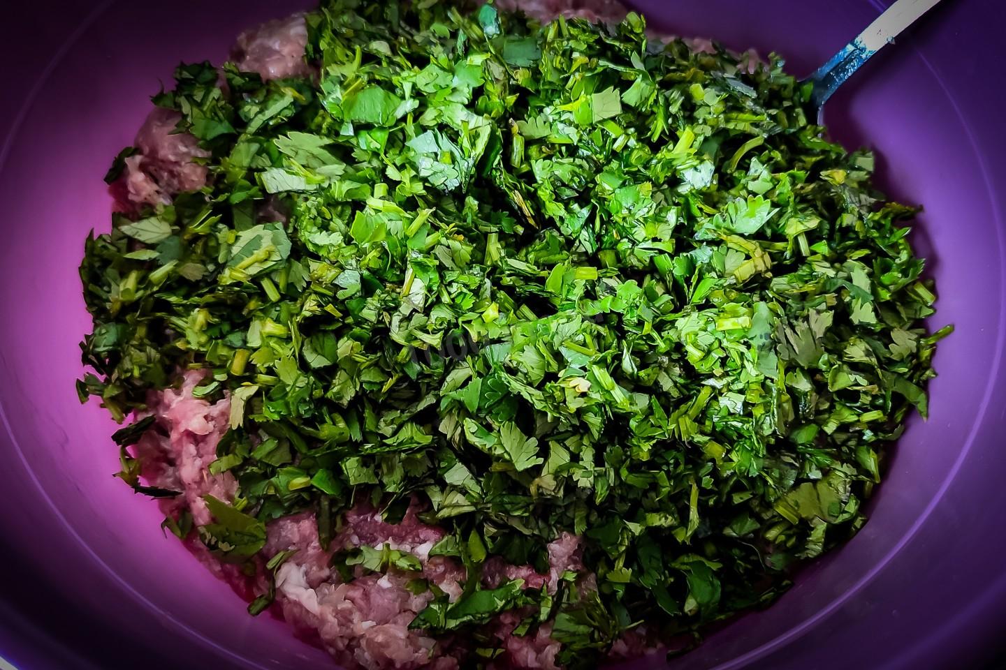 В полученный фарш всыпать молотые специи и измельчённую зелень кинзы. Кто-то и кинзу пропускает через мясорубку, но от этого (на мой вкус) она теряет свой шарм, сок и становится через чур выжатой.