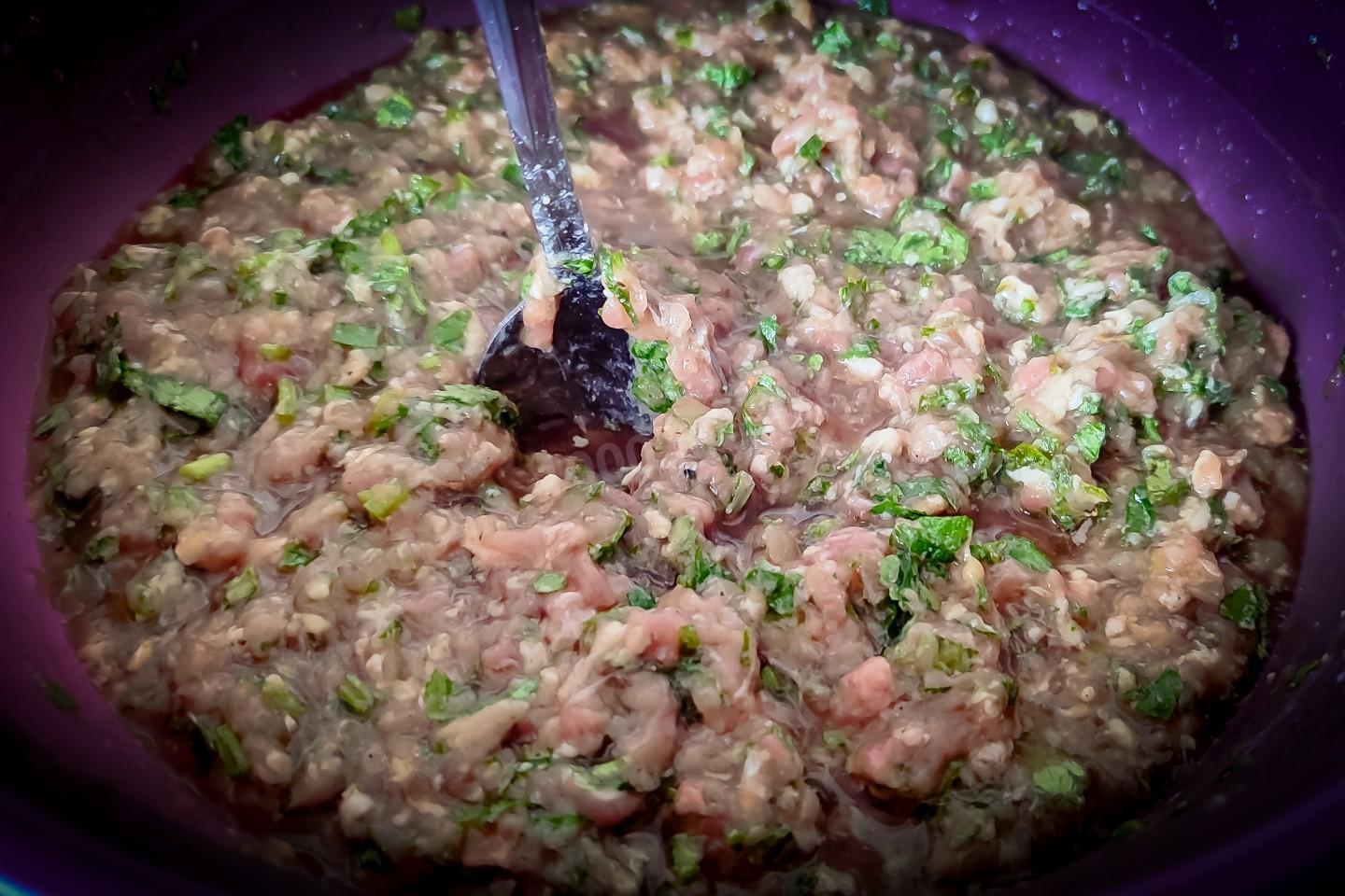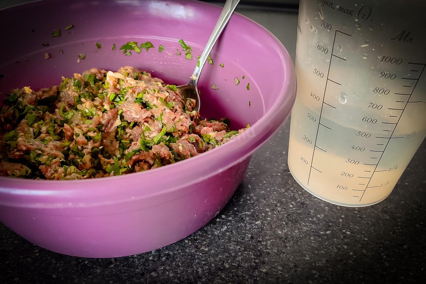 Теперь добавить в фарш холодную (тоже практически ледяную воду), делать это надо в 3-4 приёма, каждый раз всё хорошо перемешивая. Когда фарш будет готов, то его нужно тоже отправить в холодильник, чтоб он немного настоялся и разошёлся аромат и вкус специй по всему фаршу. За это время мы займёмся тестом.