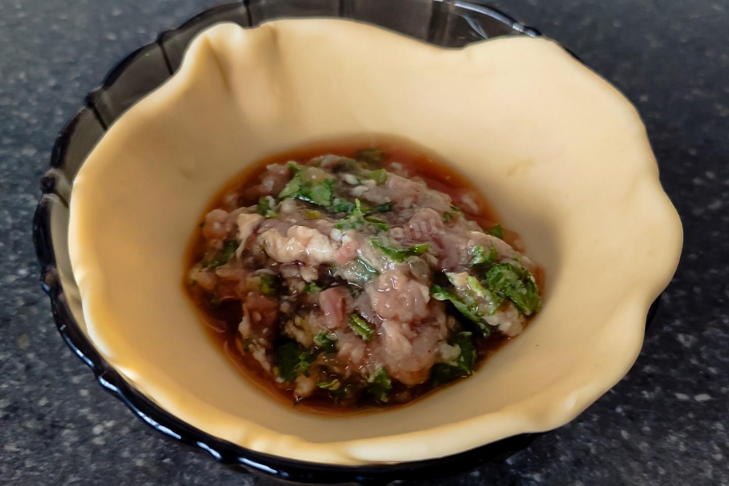 Выложить на тесто 1 столовую ложку нашего настоявшегося фарша с жидкостью. От количества жидкости будет зависеть количество бульона после приготовления.