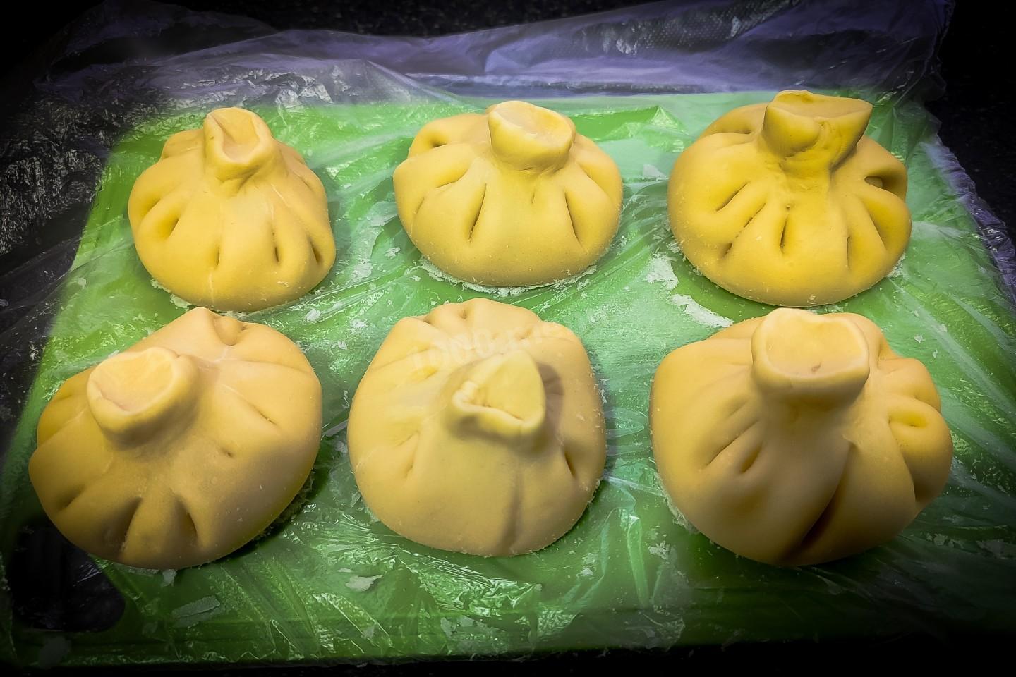 Сложить тесто над фаршем (не допускать попадания влаги в места склеивания тесто, иначе Вы не сможете слепить тесто!!!), хорошо обжать и отрезать лишнее тесто (я это делал ножницами). На этом холодная часть приготовления наших хинкали закончена.