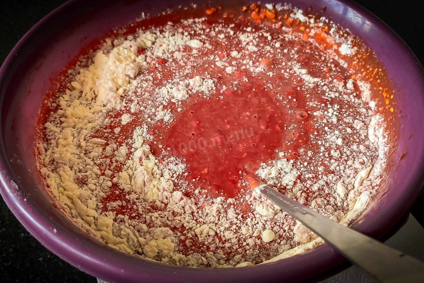 Теперь можно в три этапа добавить пшеничную муку. После каждого добавления муки, всё хорошо перемешивать, как более тщательнее, чтоб не образовывались комочки. Получится должно тесто, как на обыкновенные блинчики.