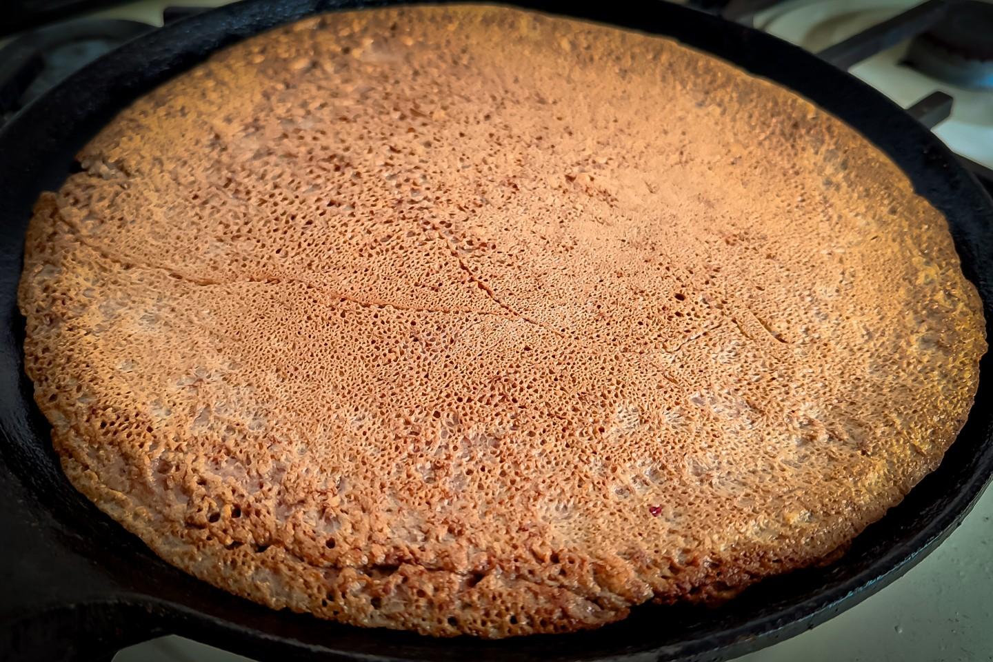 Когда тесто будет готово, разогреть хорошо сковороду (у меня чугунная специальная для блинов), смазать первый раз растительным маслом и налить получившееся тесто. Обжаривать до выпаривания жидкости в середине блинчика.