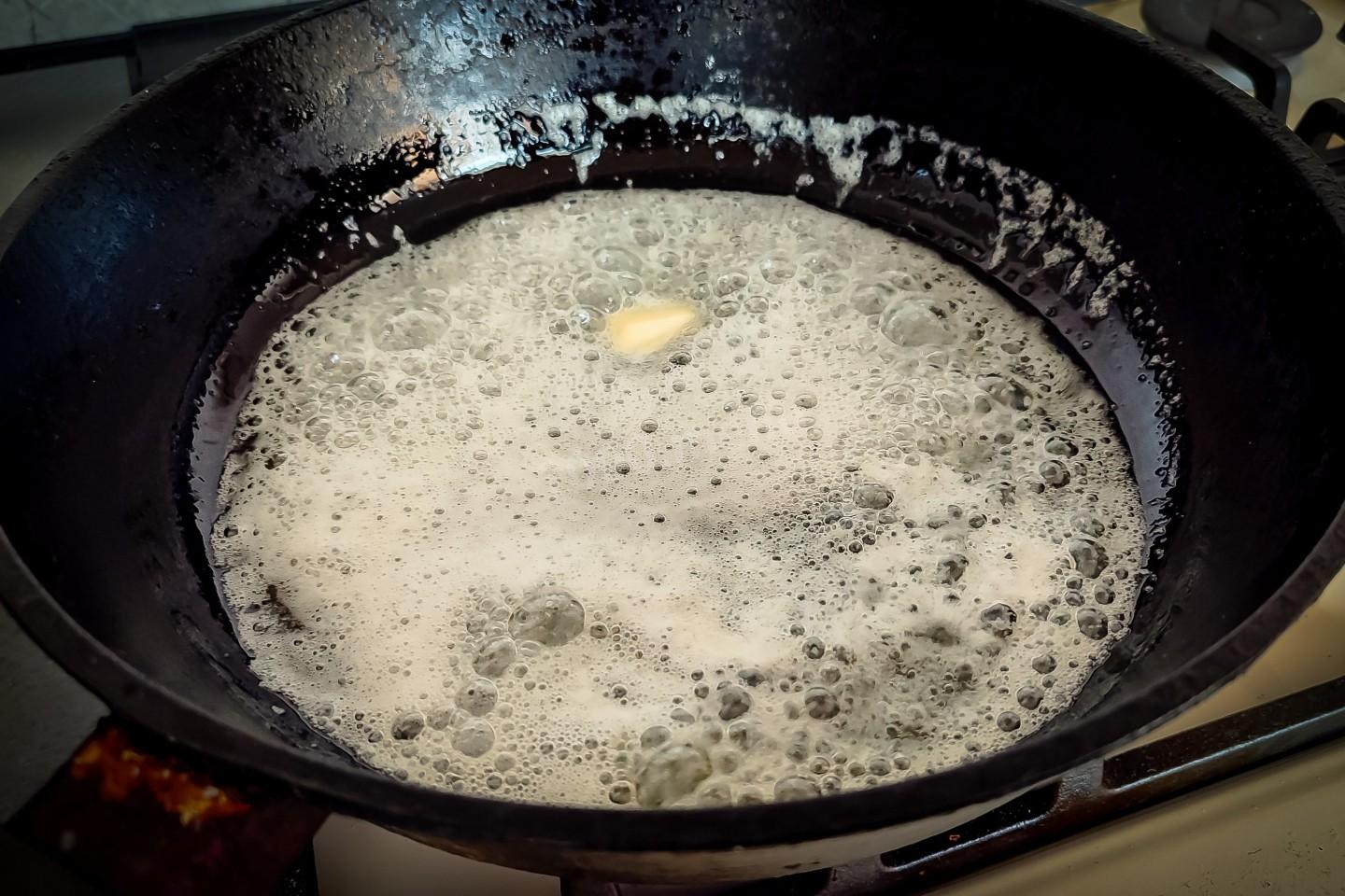 Теперь возьмём глубокую сковороду (она у меня тоже чугунная), разогреем её и положим внутрь кусочек сливочного масла. Дождёмся когда масло почти растает. Жарить его не нужно, чтоб оно не начало подгорать.