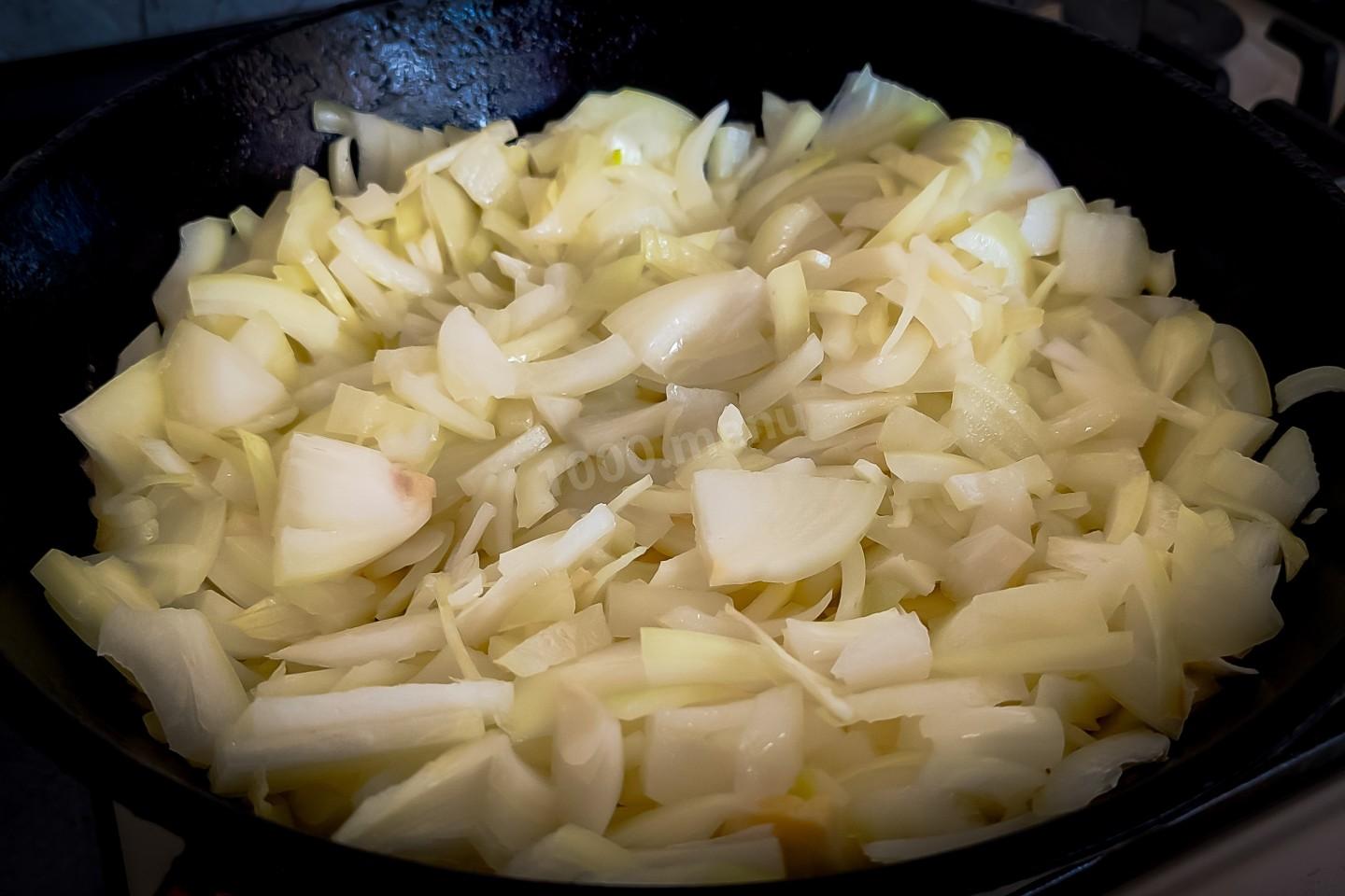 В растопленное мало всыпать лук и на сильном огне обжарить лук до его прозрачности. Теперь к луку добавим морковь и ещё минут 5 обжарим при непрерывном перемешивании. После обжарки лука с морковью, отключить огонь и тоже дать немного остыть.