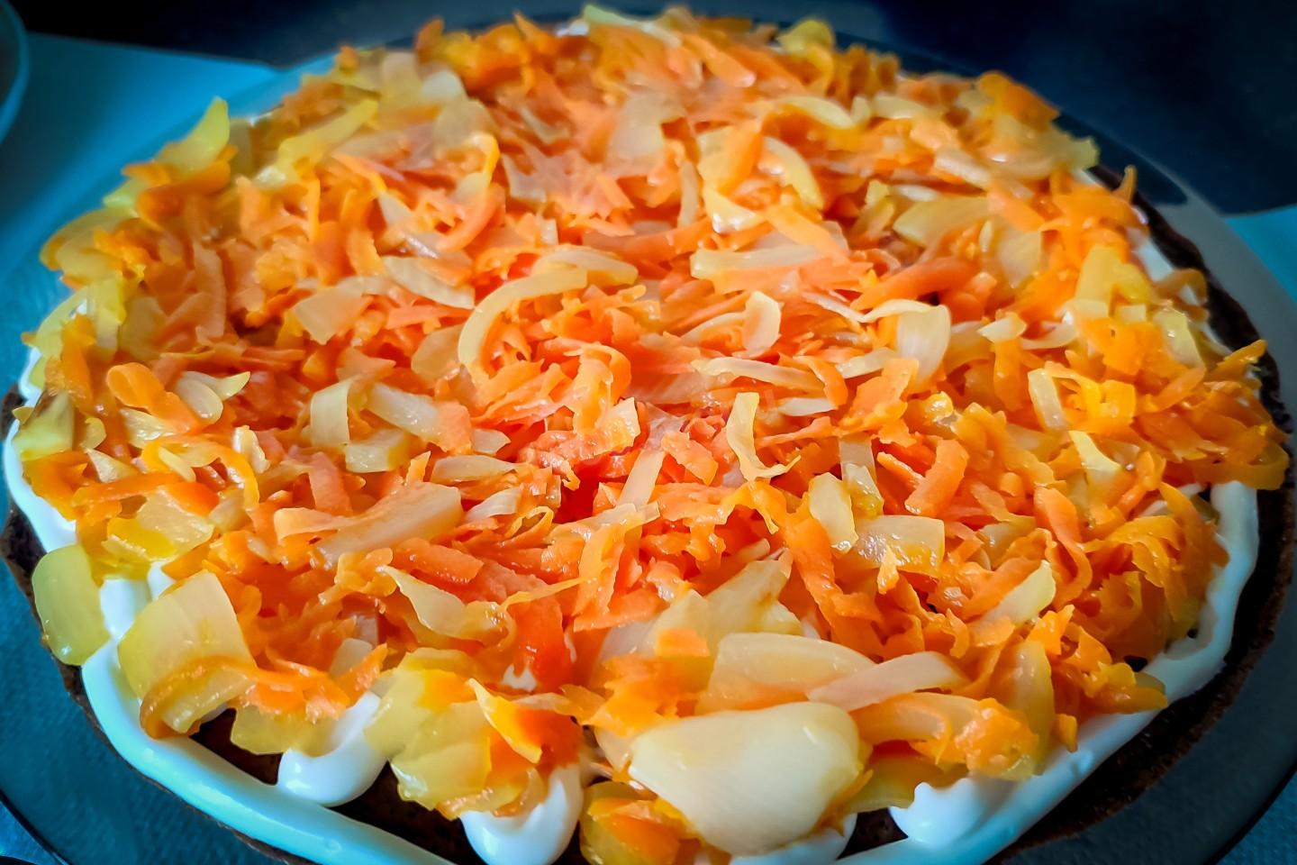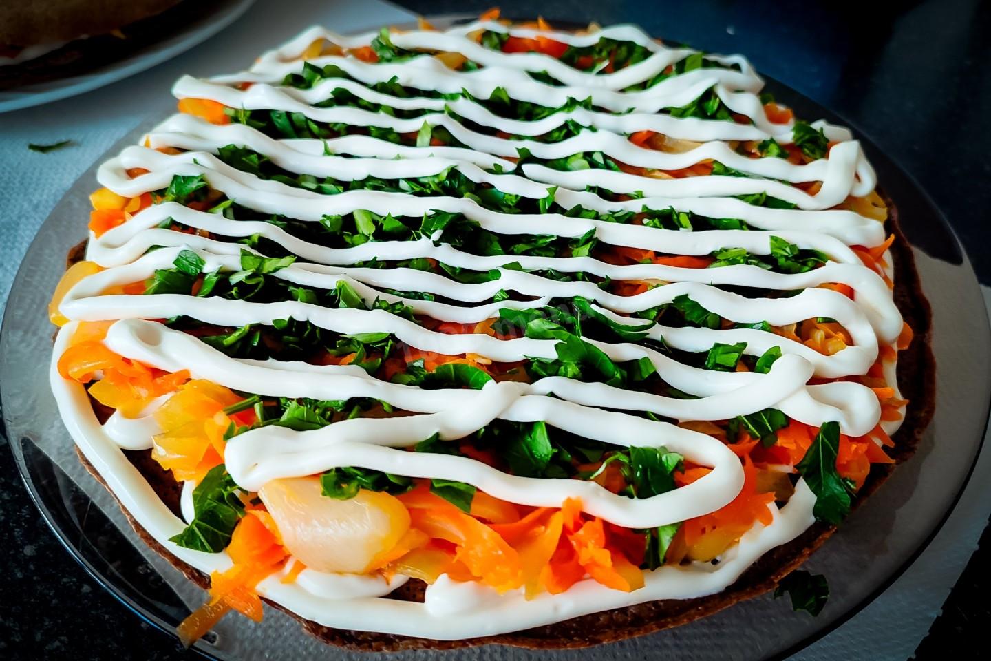 Когда все ингредиенты остынут, то можно приступать к формированию тортика. Для этого уложим первый блинчик на широкую не глубокую тарелочку, тонким слоем нанести майонез, потом выложить часть обжаренных лук и морковь, а сверху ещё раз нанести майонез.