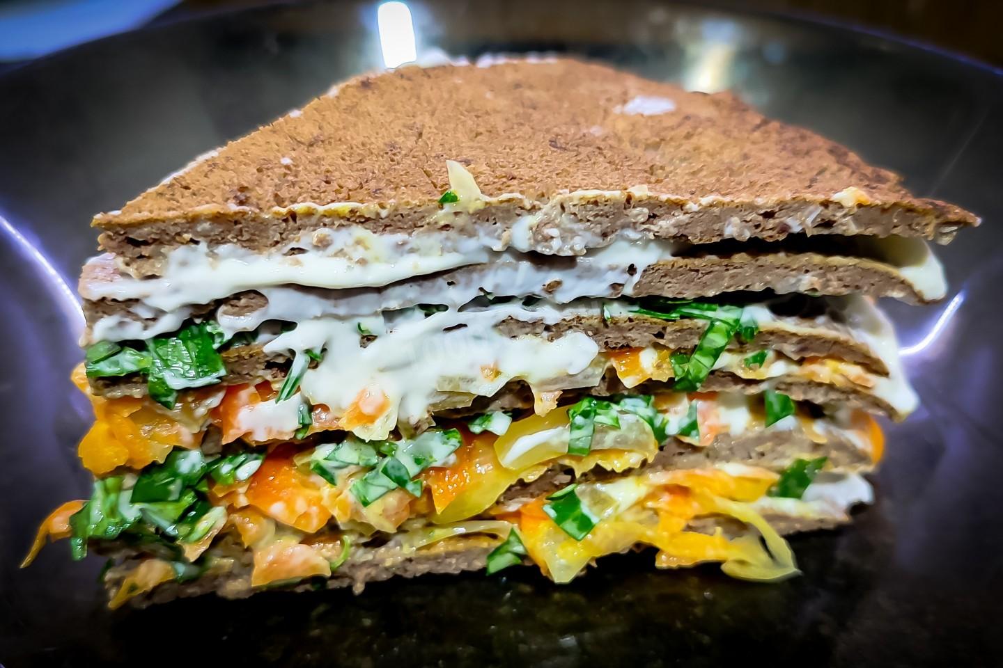 Третий слой у нас будет с добавлением измельчённой зелени. Каждый слой промазывать тонким слоем майонеза. Повторять все действия как с первого слоя до конца блинчиков. У меня вышло 6 слоёв.