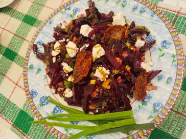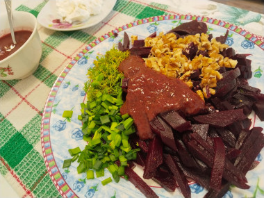 Наша семья очень любит грузинскую кухню и естественно этот салат пришёлся нам по вкусу. Его можно подавать на гарнир или как самостоятельное блюдо. Блюдо отлично может разнообразить праздничный стол. Готовить салат не сложно и на это не потребуется много времени. Помимо прочего все ингредиенты в салате доступны, низкокаллорийны и полезны, а значит он подойдёт тем кто следит за своим здоровьем и фигурой. Что касается рецепта, мне показалось маловато растительного масла, я добавила ещё столовую ложку, но это дело вкуса. Также в рецепте указан перец, но я его не добавляла, мне попался прямо острый соус ткемали, остроты мне хватило и без перца, но если Вы любите поострее добавляйте перец это также дело вкуса. Муж и сын не любят свеклу, но этот салат ели с удовольствием, что меня очень порадовало! Приготовьте такой салат, удивите Ваших родных и близких.