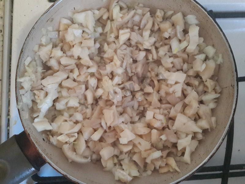 В это время мелко нарезаем грибы и лук.