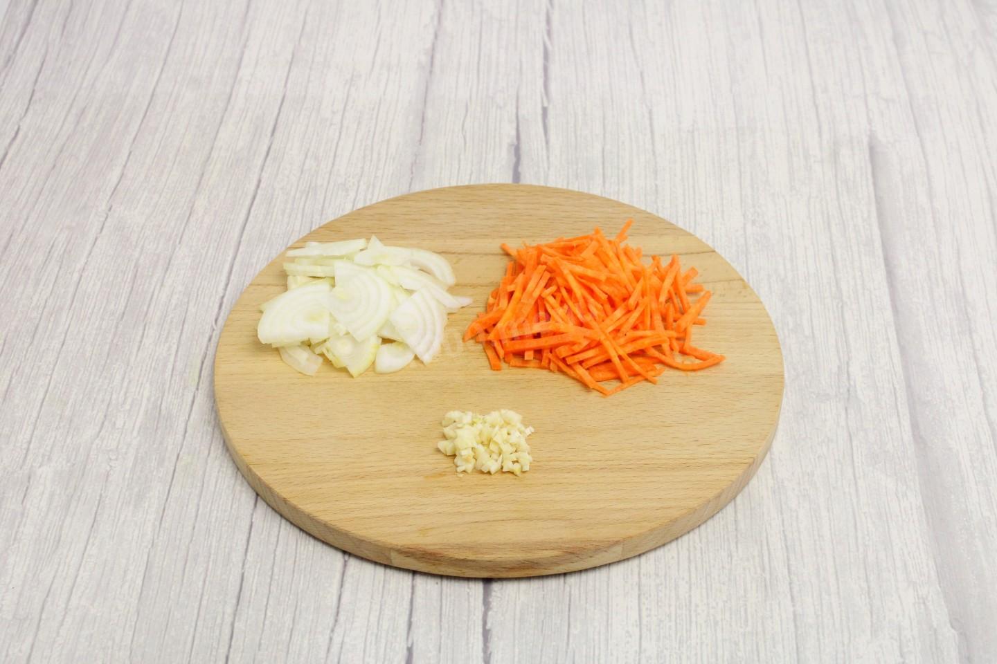 Овощи помойте, очистите, сполосните. Морковь нарежьте тонкой соломкой, репчатый лук – тонкими полукольцами. Чеснок мелко порубите или пропустите через пресс.