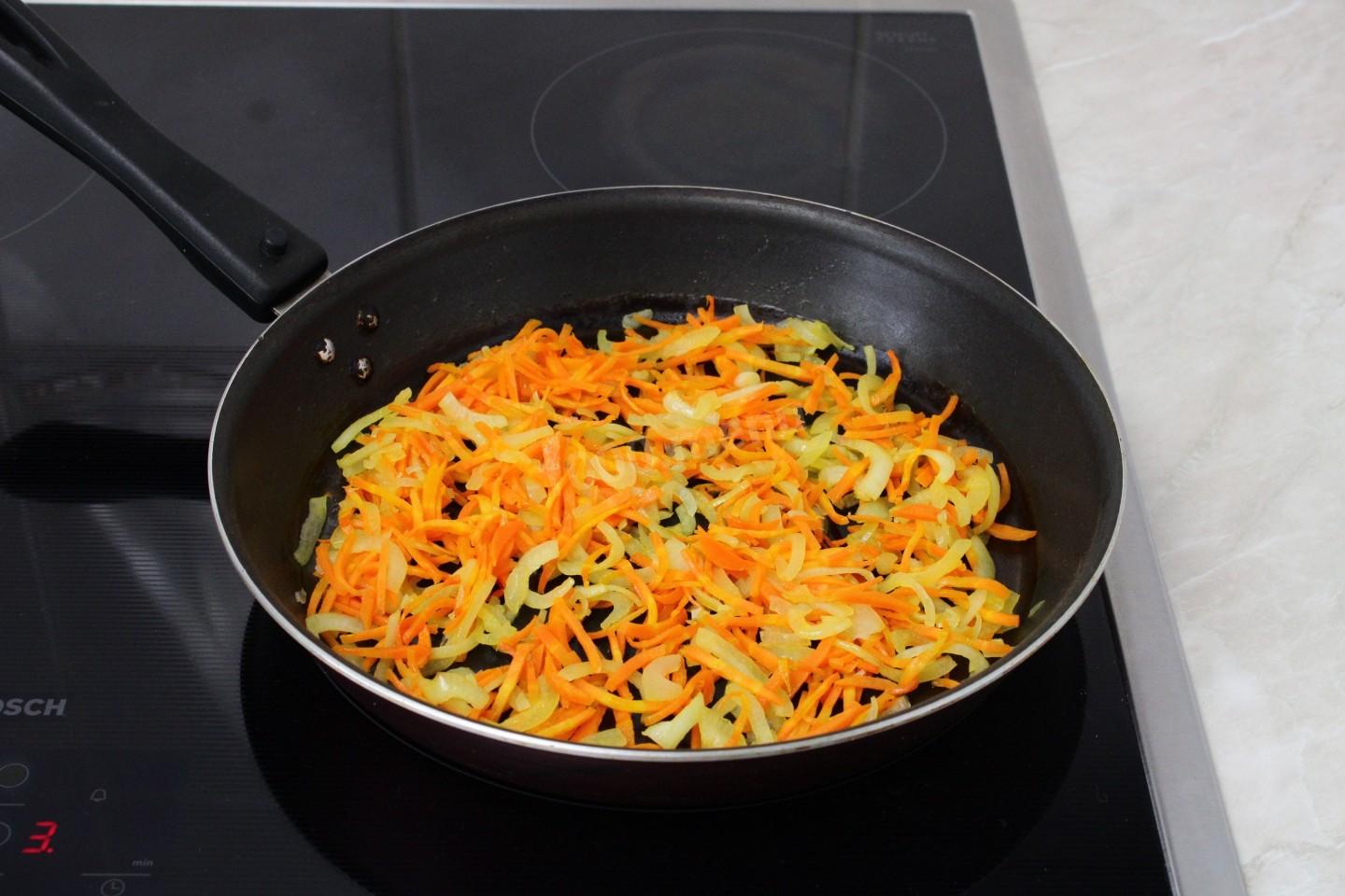 На сковороде разогрейте растительное масло, обжарьте лук и морковь на среднем огне, помешивая, около 7 минут. Информацию о выборе сковороды читайте после описания шагов. Ссылка там же.