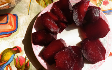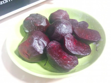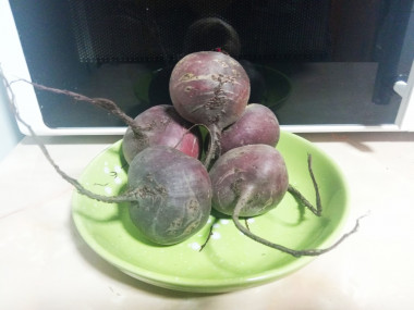 Всем привет . Хочу добавить свой вариант . Можно взят кальку , бумагу для выпечки , если нечего нет любой белый лист бумаги . Подготовить свёклу. Бумагу смазать растительным маслом , завернуть свёклу в неё и в микроволновку на 5-9 мин . ( зависит от размеры) . Готовность можно проверить ножом или вилкой . Чуть не дошла , ещё на пару мин и все готово .