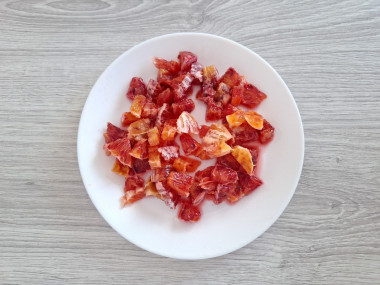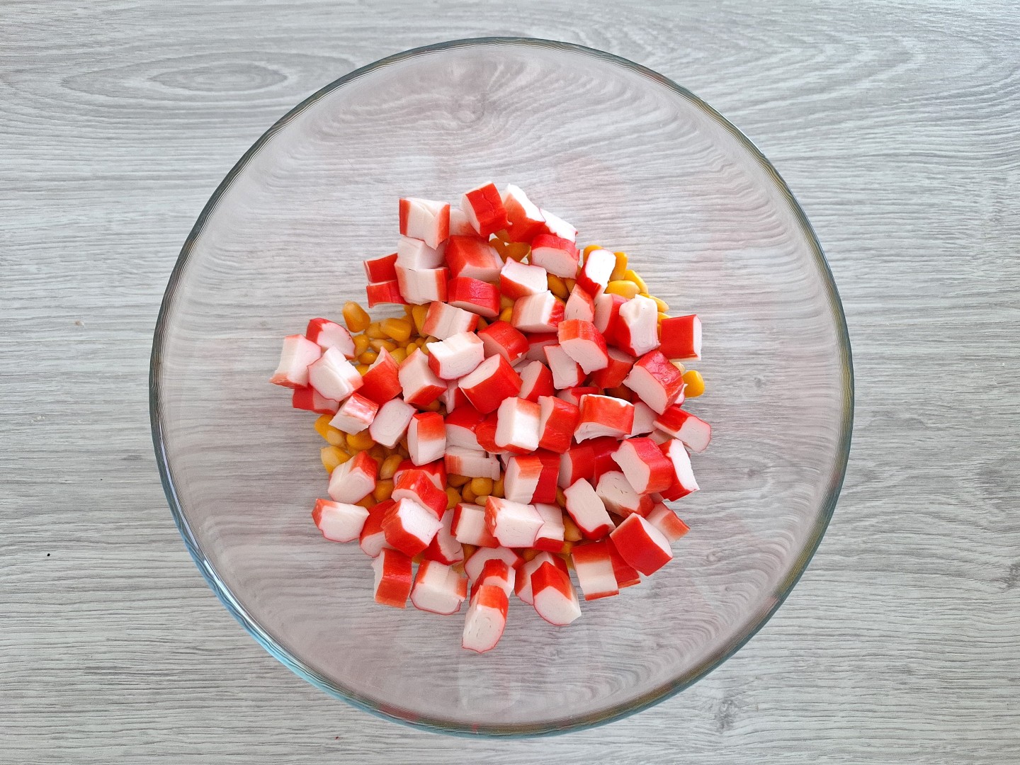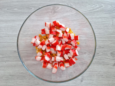 Нарежьте крабовые палочки небольшими кубиками и переложите в чашу, в которой будете готовить салат.