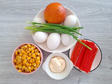 Как сделать салат с апельсином и крабовыми палочками? Подготовьте для этого необходимые ингредиенты. Пропорции ингредиентов можно немного изменить в любую сторону по своему вкусу. Баночку с консервированной кукурузой откройте и слейте с неё всю жидкость. Яйца заранее отварите в кипящей воде 7-8 минут. Затем горячую воду слейте, а яйца залейте холодной водой и дайте им полностью остыть.