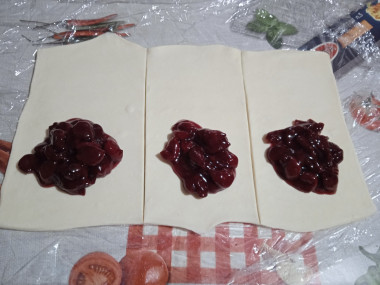 Приготовила слоёные пирожки с вишней. Использовала покупное слоёное тесто. Вишню взяла замороженную без косточек. Для начинки в пирожки я вишню с сахаром и крахмалом приварила, чтоб густая была и не вытекала. Слоёное тесто разморозила, раскатала, нарезала прямоугольниками, разложила начинку и защипнула края вилкой для красоты. Смазала пирожки взбитым яйцом и выпекала в духовке 20 минут. Результат превосходный. Слоёные пирожки вышли невероятно вкусными. Тесто хорошо пропеклось, начинка не вытекала. Очень вкусная домашняя выпечка с большим количеством начинки. А вишнёвая начинка моя самая любимая. Кушали все с большим удовольствием. Поэтому приготовила сразу и вторую порцию, уж больно вкусно. Готовить совершенно просто и быстро. Прекрасный рецепт! Благодарю автора!