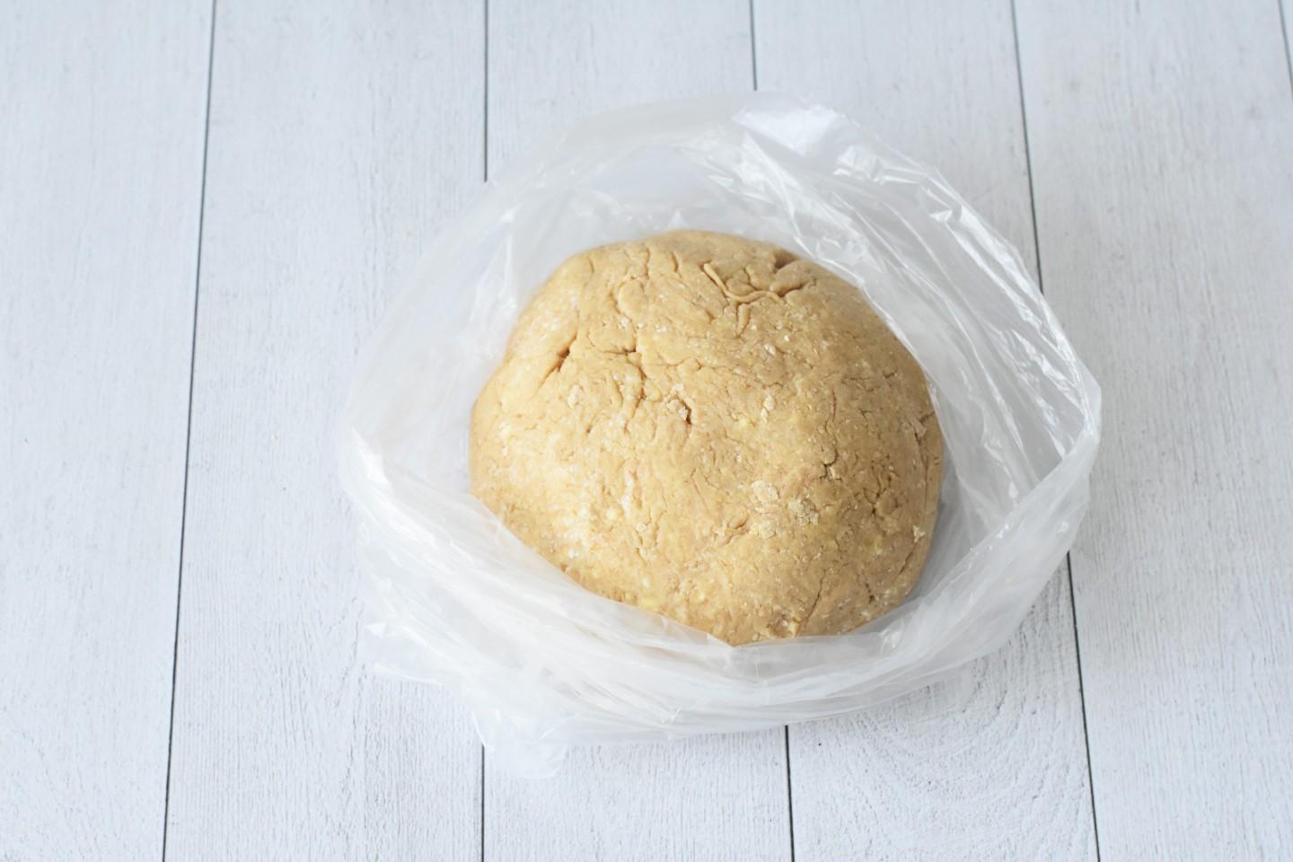 Всыпьте просеянную с разрыхлителем муку и замесите мягкое однородное слегка липкое тесто. При необходимости добавьте еще муки. Цельнозерновую муку можете заменить на любую без глютена: рисовую, кукурузную и т. д. Но учтите, что муки других видов может понадобиться больше или меньше. Подробнее о муке и её замене читайте в конце рецепта. Тесто скатайте в шар, заверните в пакет и положите на 30 минут в холодильник.
