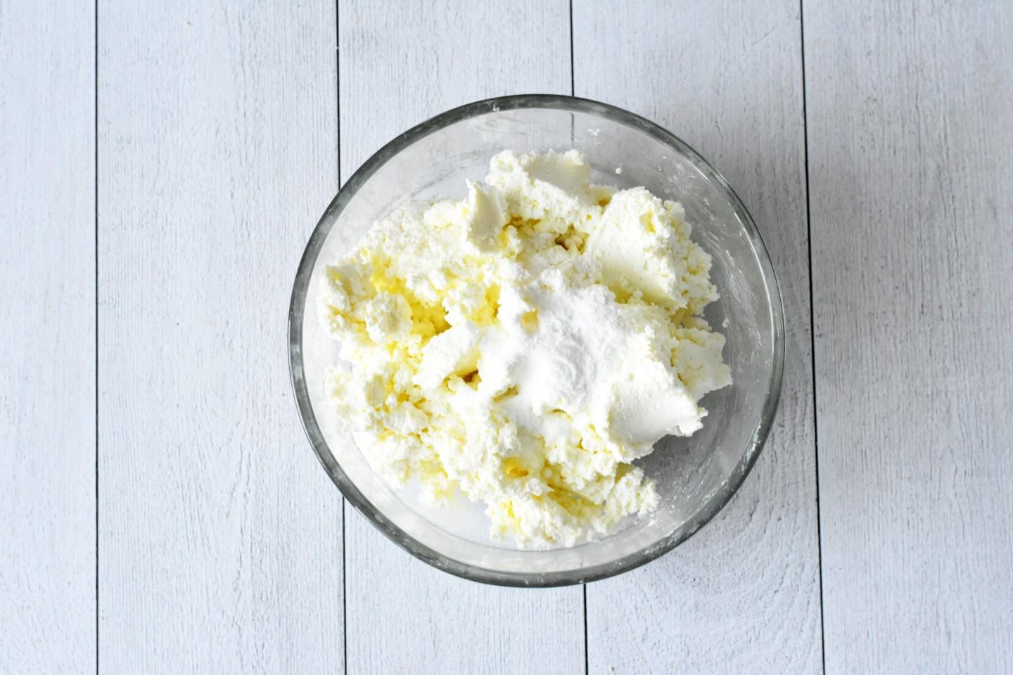 В творог добавьте сахарозаменитель и перемешайте до однородности.