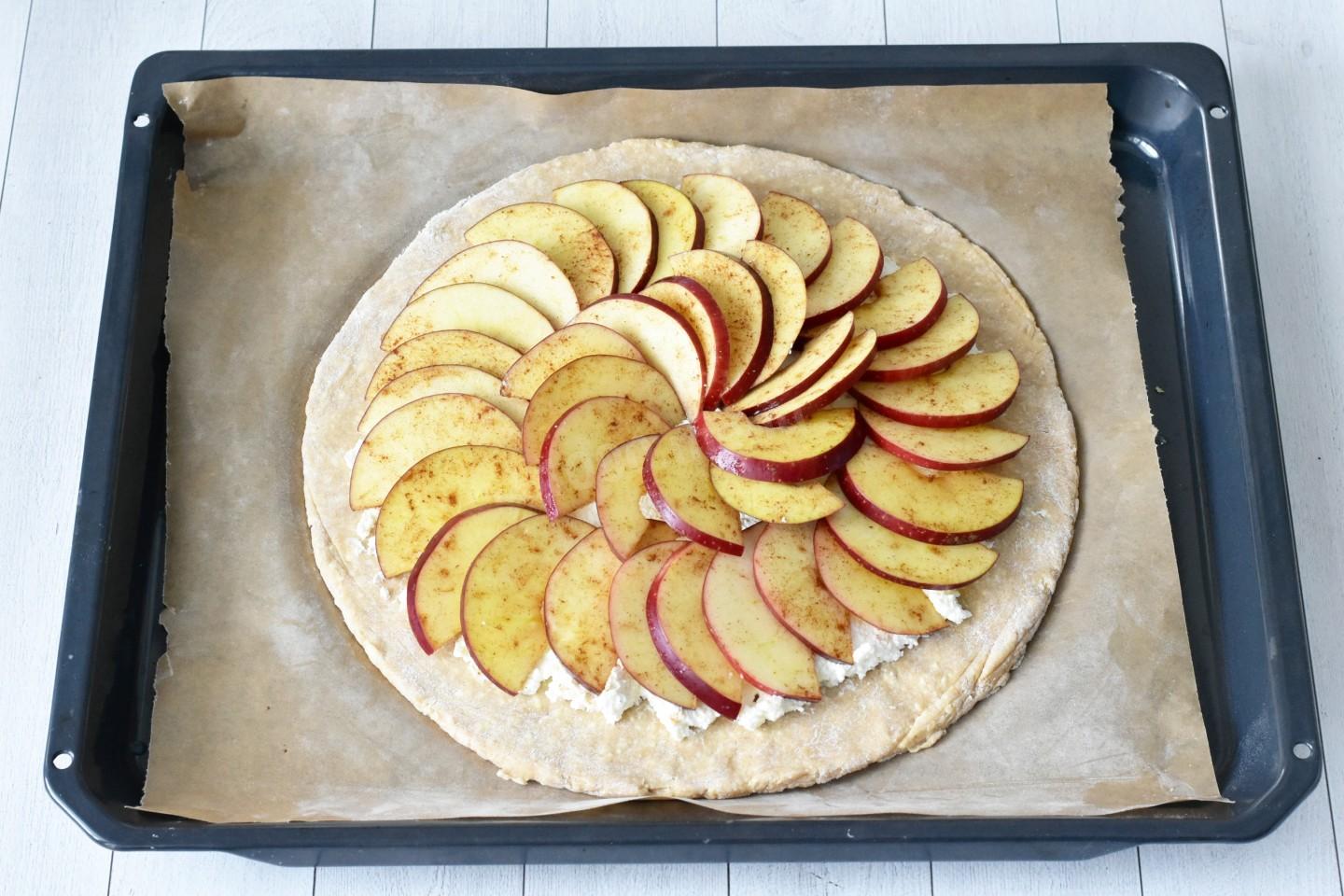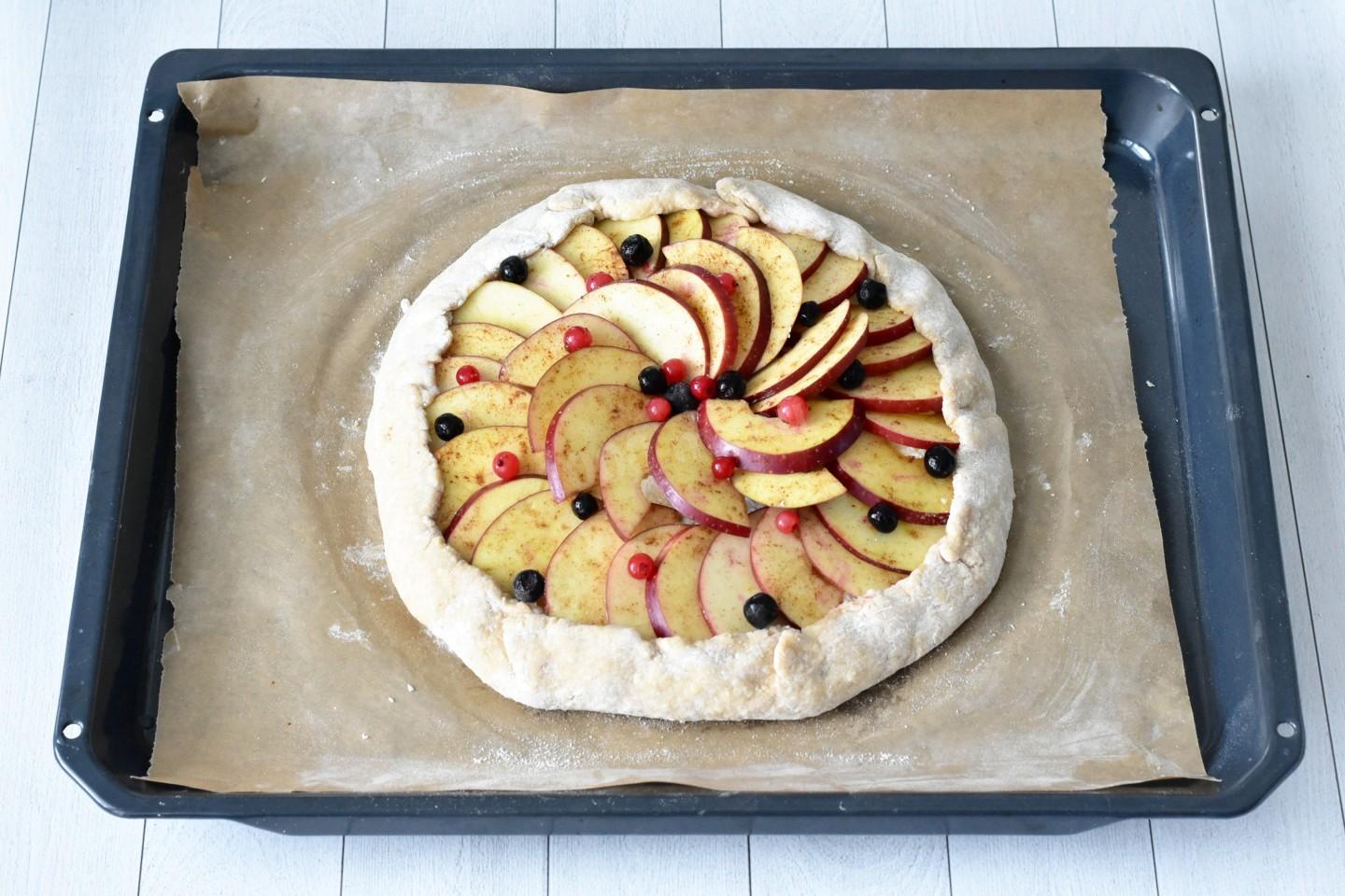 Охлажденное тесто раскатайте на присыпанном мукой листе пергамента в круг толщиной 3-4 мм. В центр выложите творожную начинку. Поверх творога распределите дольки яблок и ягоды. Края теста загните поверх начинки и сформуйте складки.