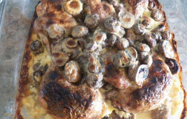 А в двух словах,отдельно курицу расчленить и пожарить на сильном огне, и грибы отдельно пожарить, в конце полить лимонным соком. Уложить курицу на противень, немного пропечь в духовке, достать, сверху курицы положить грибы и полить сметаной со взбитым желтком. Допечь в духовке минут десять до румяной корочки. Да и не забудь про соль и черный перец. Ну вот так, если подойдет займись на радость всем своим