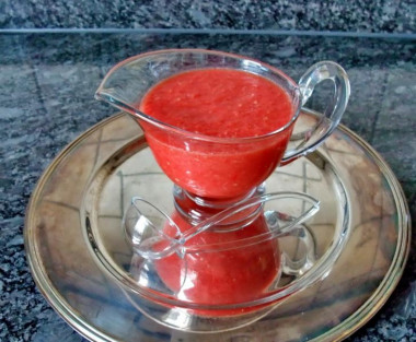 Стекшие помидоры переложите в глубокую посуду и измельчите блендером, добавьте сладкий перец, снова измельчите и перемешайте массу деревянной лопаткой. К томатно-перечному пюре добавьте чеснок, хрен, острый перец и еще раз измельчите блендером, перемешайте и отставьте в сторону настаиваться примерно на 30 минут. Хочу заметить, что соус может получиться немного жидковатым. Если вы предпочитаете погуще, отделите лишнюю жидкость с помощью сита.