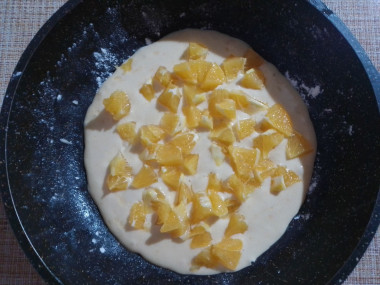 В тесто добавила цедру апельсина, ванилин и соду гашеную уксусом. Форму смазала растительным маслом и присыпала мукой, вылила немного теста, уложила сверху 2 нарезанных апельсина (ягоды не добавляла), сверху вылила оставшееся тесто и поставила выпекаться.
