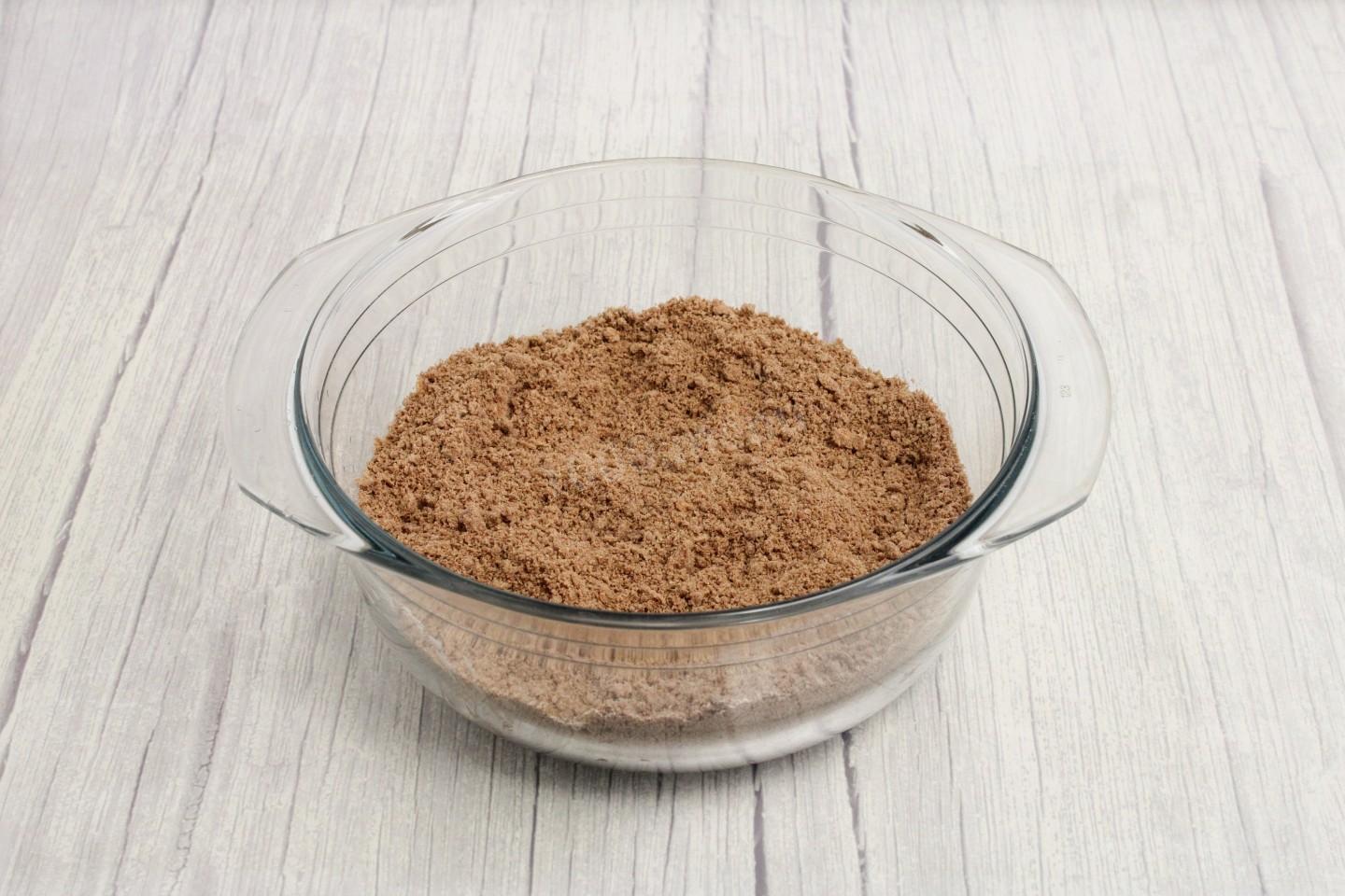 Сухие ингредиенты (муку, сахар, разрыхлитель, какао) смешайте и просейте в миску. В мучную смесь натрите холодное сливочное масло. При этом окунайте масло в мучную смесь, чтобы оно меньше прилипало к терке. Сливочное масло должно быть именно холодным, поэтому доставайте его непосредственно перед приготовлением. Быстро перетрите руками масло с сухими продуктами до получения мелкой рассыпчатой крошки. Включите духовку разогреваться на 180 С.