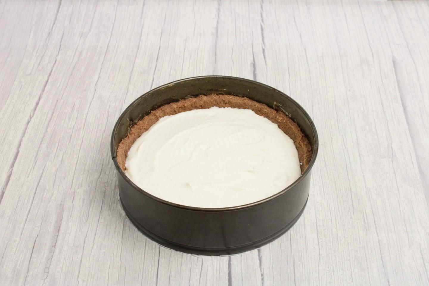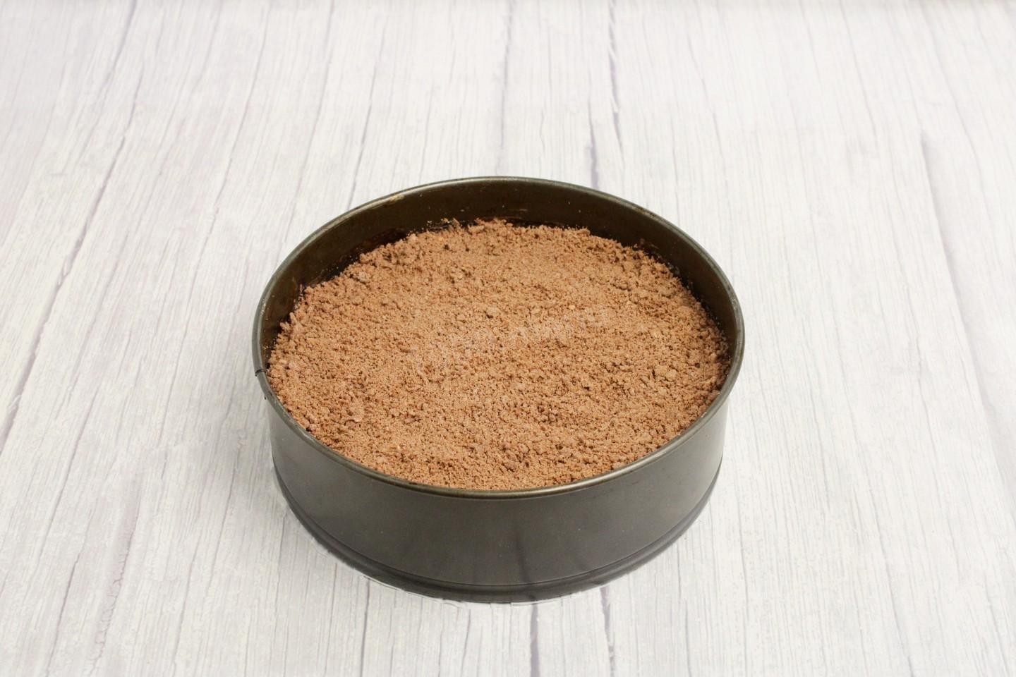 Дно формы для выпечки застелите пергаментом, стенки смажьте растительным маслом. У меня форма диаметром 20 см. О выборе формы для выпечки и пергамента читайте после описания шагов в статьях по ссылкам. Выложите чуть больше половины шоколадной крошки в форму. Хорошо прижимая, распределите крошку по дну формы и сформируйте бортики. Заполните основу пирога творожной начинкой, разровняйте. Равномерно присыпьте начинку остатками песочной крошки.