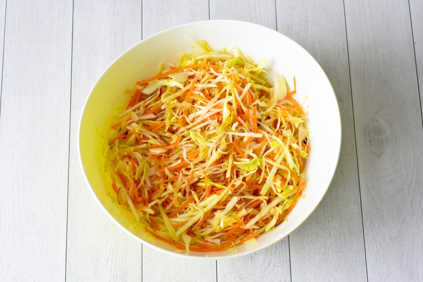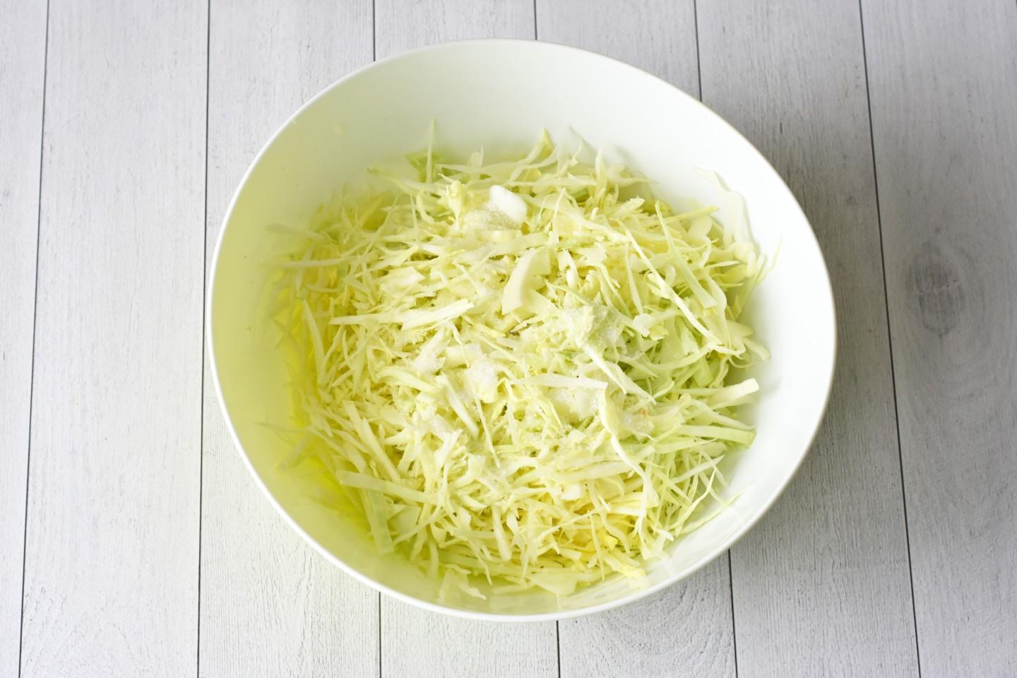 У свежей капусты снимите верхние поврежденные листья. Капусту нашинкуйте, обходя плотные жесткие листья вокруг кочерыжки. Выложите капусту в миску. Добавьте сахар и соль и перетрите все руками, чтобы капуста пустила сок.