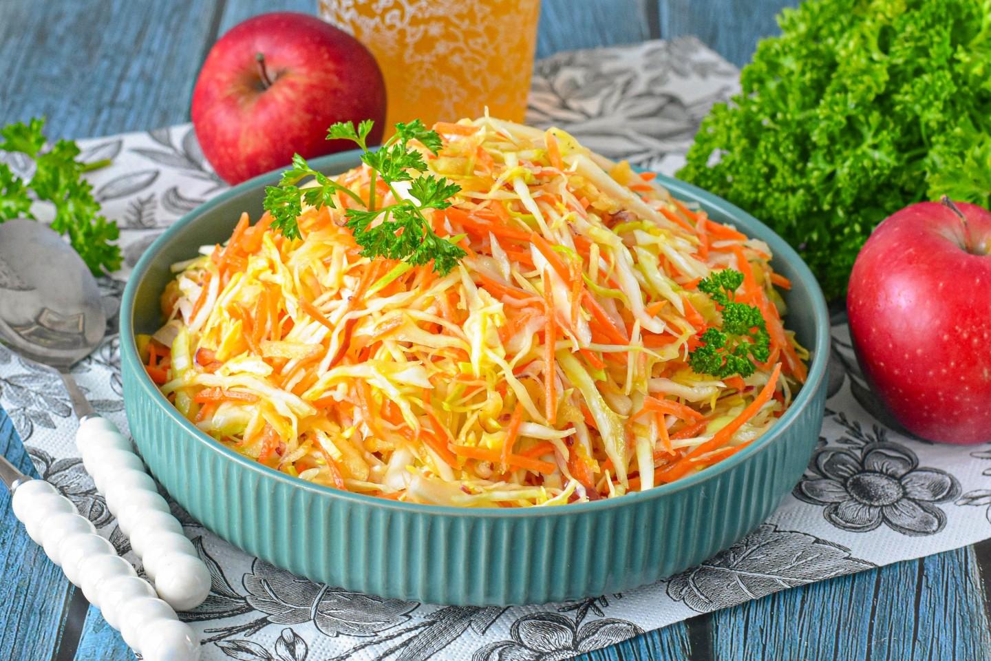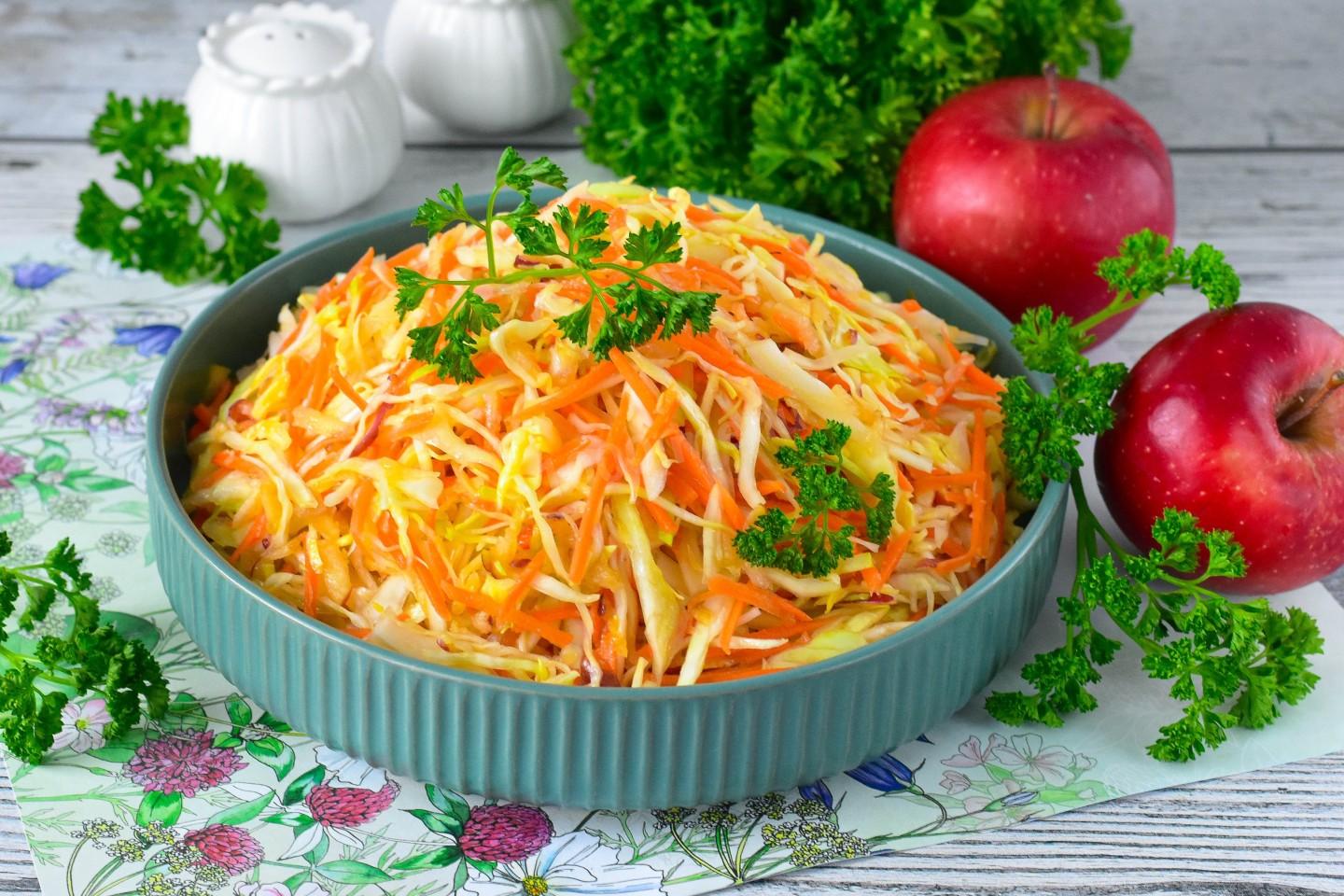 Этот легкий салат с капустой и яблоком — настоящий кладезь витаминов. Клетчатка из свежей капусты и моркови мягко очищает организм, а яблоки богаты пектинами и железом. Заправка из оливкового масла помогает усвоению жирорастворимых витаминов, делая блюдо не только диетическим, но и невероятно полезным для иммунитета.