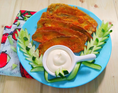 Приготовила баклажаны в кляре жареные на сковороде. Баклажан нарезала тонкими кружочками( до 0,5 см), всё таки решила их присолить, чтобы наверняка быть уверенной, что не будет чувствоваться горечь. Через 10 минут баклажаны отжала. Для кляра использовала пшеничную муку, присаливать ее не стала, баклажаны уже соленые. Каждый кружок опускала во взбитое яйцо и муку дважды. Обжаривала баклажаны до зарумянивания кляра. Просто, быстро и вкусно! Спасибо, Наталья!