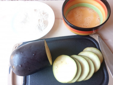Баклажан вымойте, обсушите, отрежьте плодоножку и нарежьте кружками толщиной 3-5 мм. Хочу заметить, что раньше баклажаны для устранения горечи вымачивали в соленой воде. Нынешние сорта баклажан практически не горчат и их можно сразу готовить. Если же вы чувствительны к горечи в баклажанах, можете замочить нарезанные кружки минут на 10 в соленой воде.