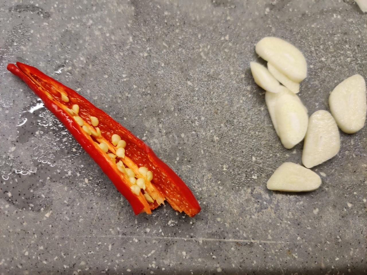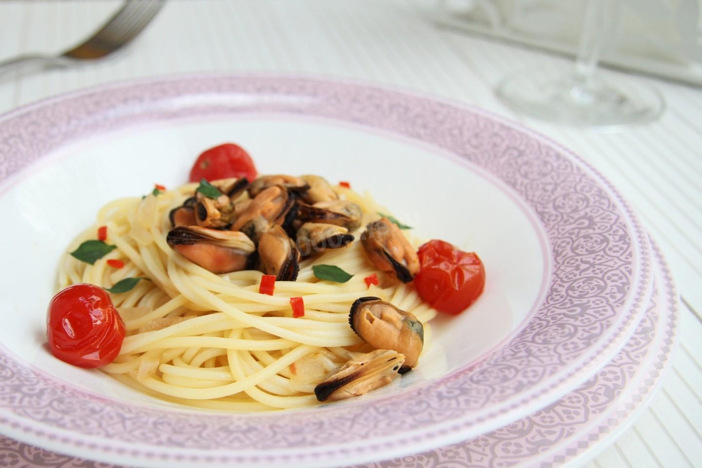Как сделать спагетти с мидиями луком и помидорами черри? Подготовьте необходимые ингредиенты. Чеснок очистите и нашинкуйте колечками. Стручок перца чили вымойте, удалите стопку и очистите от семян.