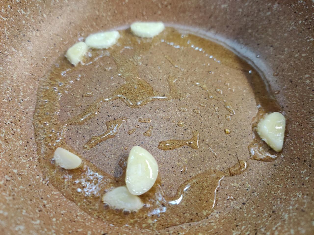 Сперва необходимо ароматизировать оливковое масло. Разогрейте его на сковороде. И обжарьте чеснок до золотистого цвета.