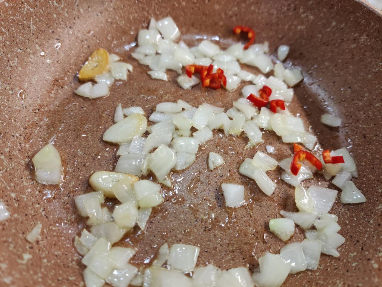 Как только чеснок слегка зарумянится, добавьте в сковороду мелко нарезанный репчатый лук. Обжарьте его пару минут до мягкости.