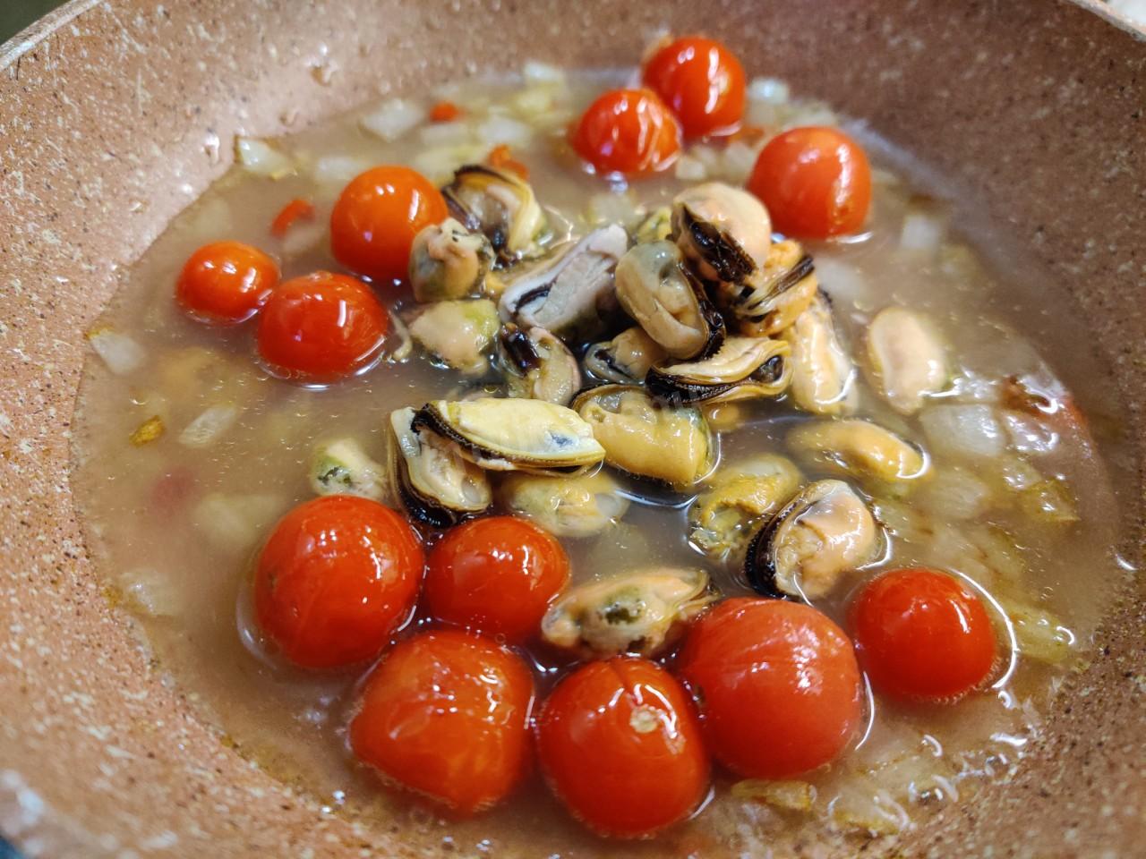 В сковороду влейте белое сухое вино и добавьте мидии. На высоком огне выпаривайте вино в течение пяти-шести минут. Соуса должно немного остаться. Посолите, если это необходимо.