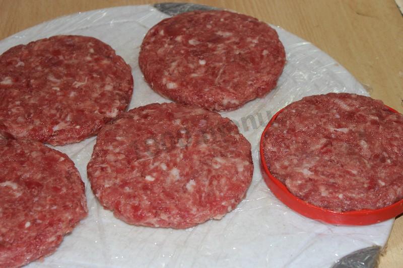 Как сделать чизбургеры с котлетой огурцом и пекинской капустой с сыром? Булочки разрезать напополам, на сухой, горячей сковороде посушить их срезами вниз до румяной корочки. В фарш добавить яйцо, соль, перец и панировочные сухари. Хорошенько перемешать. Теперь делаем наши котлеты. Чтобы они были как можно красивее и ровнее, я решила использовать крышку для банки с большим горлом. Смазала её растительным маслом и утрамбовывала туда фарш.