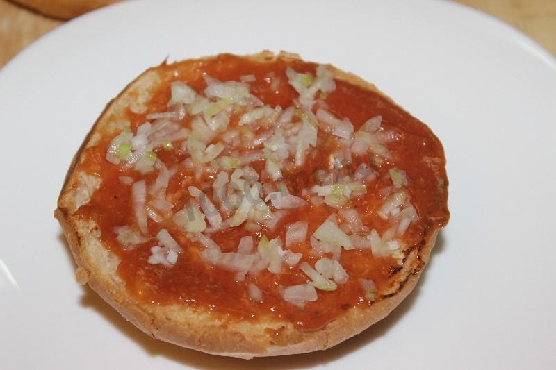 Лук ОЧЕНЬ мелко нарезать и замариновать в смеси уксуса и кипятка в течение 15-ти минут. Затем лук отцедить от жидкости. Горчицу смешать с кетчупом в отдельной мисочке. Огурец нарезать тонкими кружочками. Теперь собираем наши чизбургеры. На "крышечку" булочки наносим смесь горчицы и кетчупа. Сверху посыпать маринованным луком.