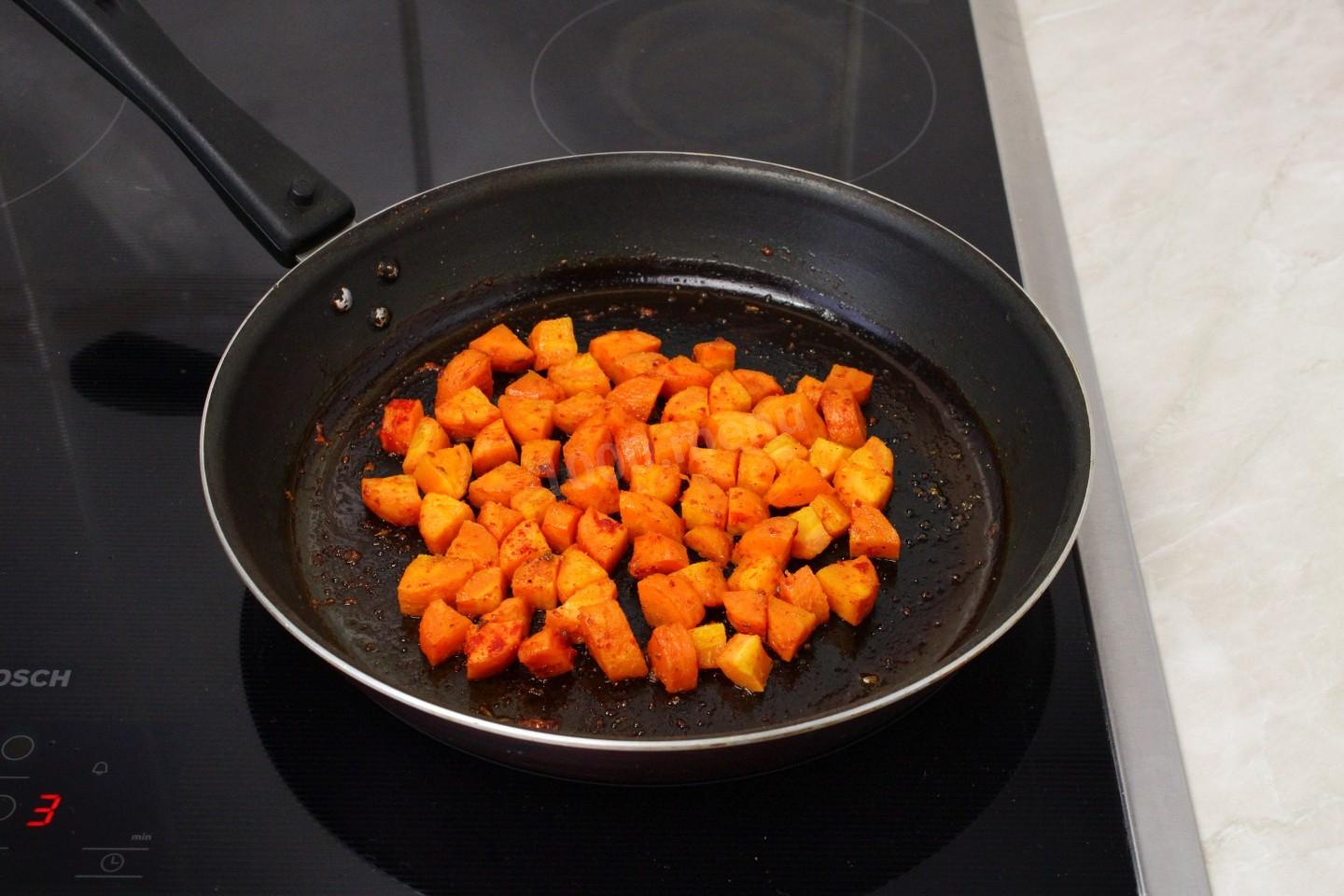 На сковороде растопите сливочное масло, выложите морковь. Выбрать сковороду и определиться с температурой обжаривания можно из статьи по ссылке после описания шагов. Обжарьте морковь на среднем огне, помешивая, около 10 минут. Добавьте зиру, обжарьте овощ еще 2-3 минуты. Всыпьте остальные молотые приправы (кориандр, мускатный орех, паприку), добавьте примерно 3 столовые ложки горячей воды.