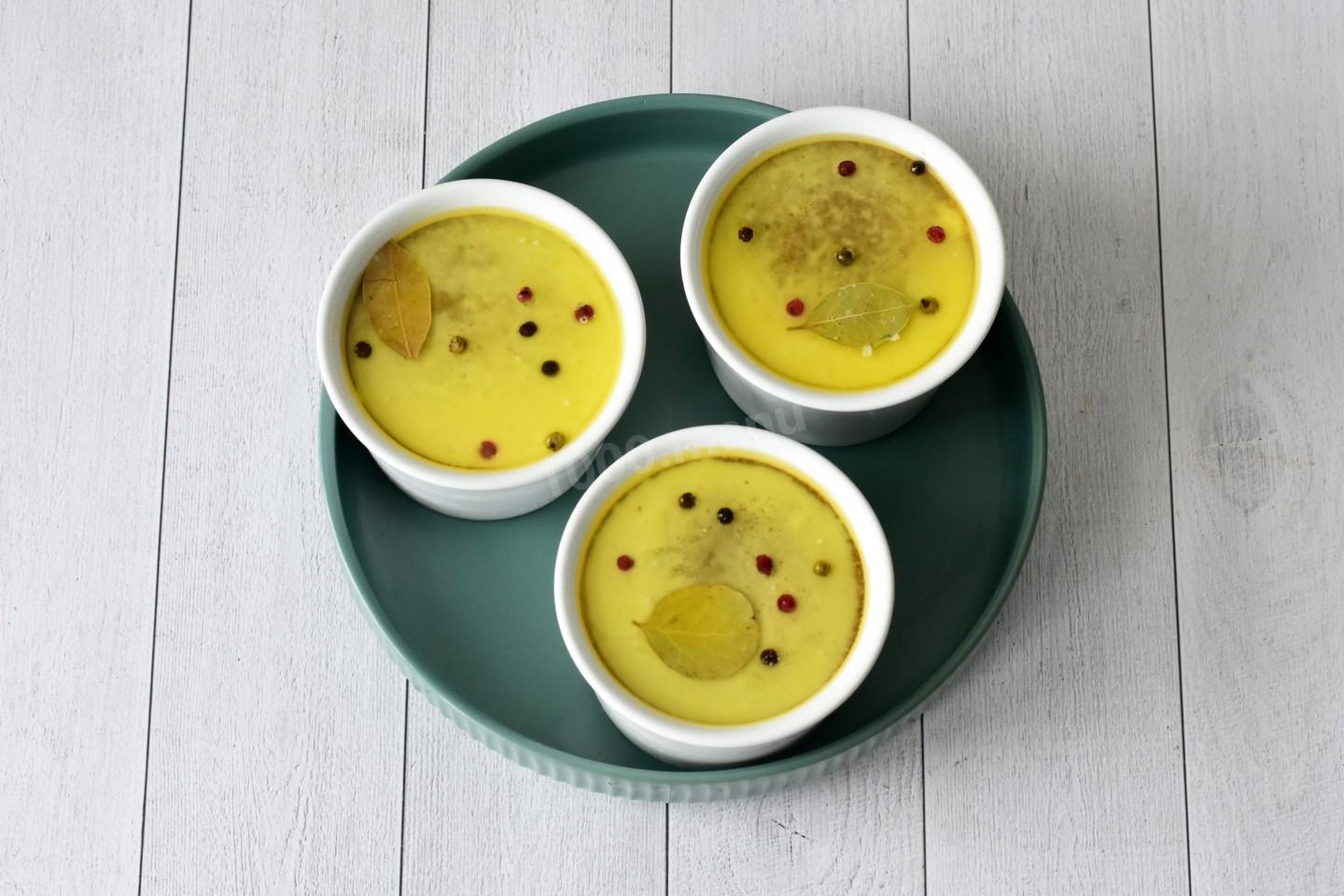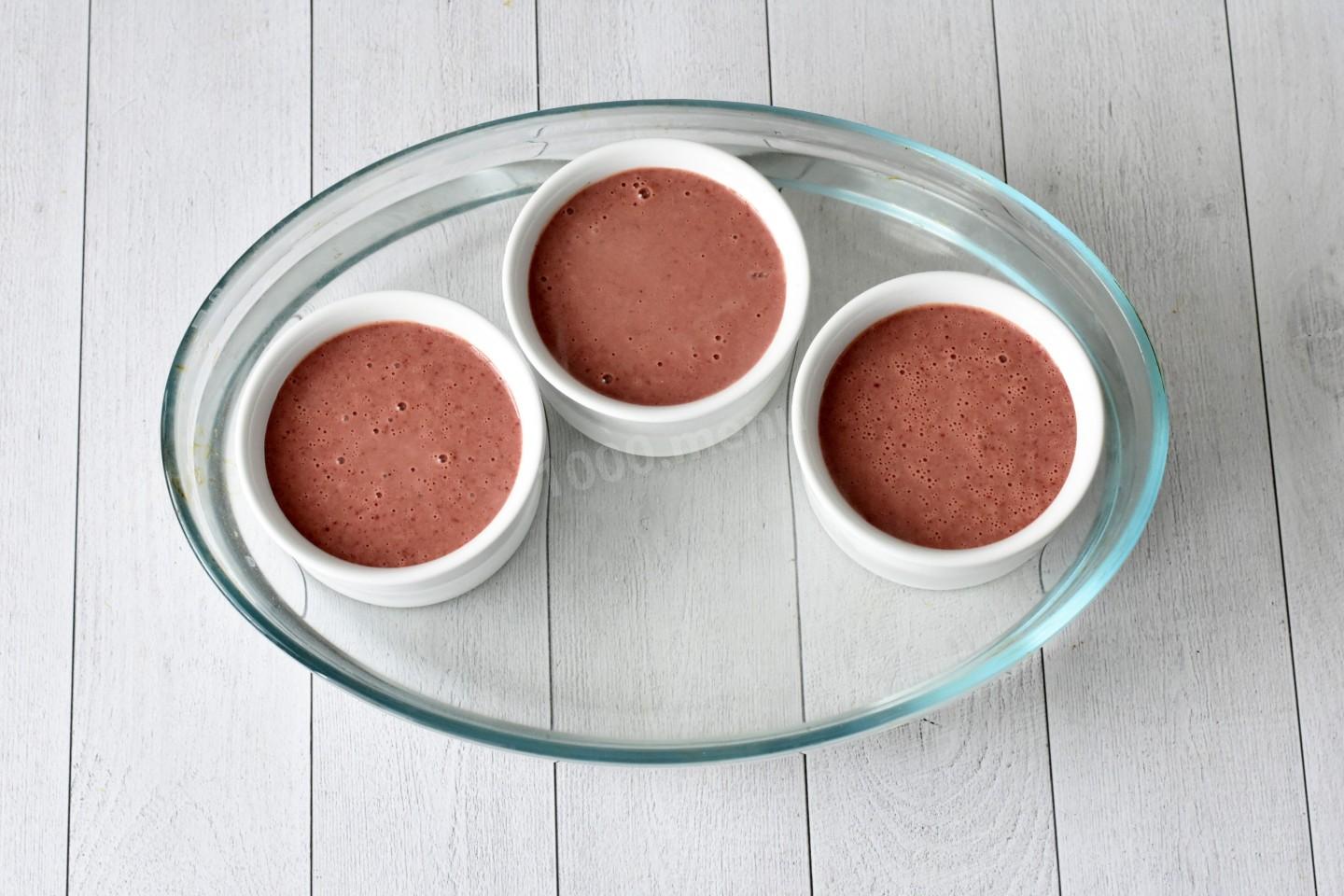 Разлейте печеночную массу по небольшим жаропрочным формочкам для запекания. Формочки поставьте в большую жаропрочную форму. Влейте столько кипятка, чтобы он доходил до середины формочек или выше.