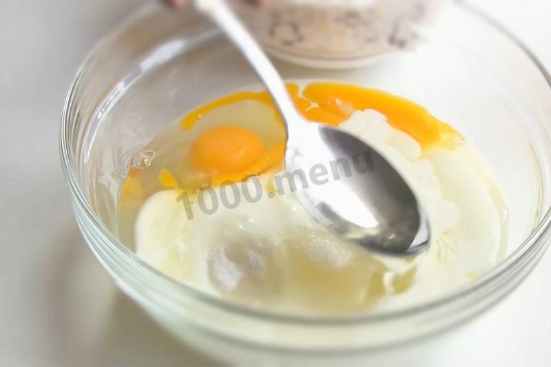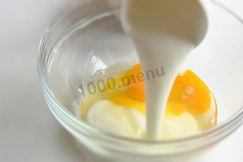 Как испечь заливной пирог с консервированной горбушей? Подготовьте необходимые ингредиенты. В миску для теста разбейте яйца.