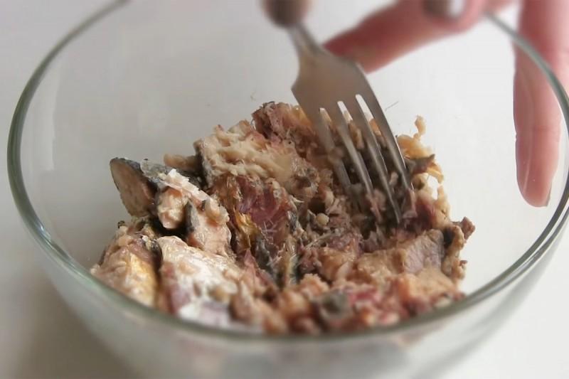 В миску для начинки выложите рыбу без бульона. Разомните рыбу вилкой.