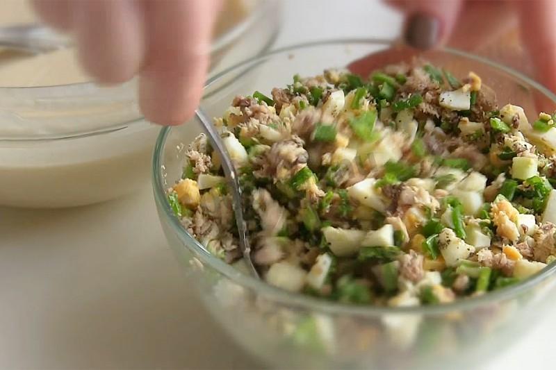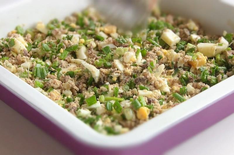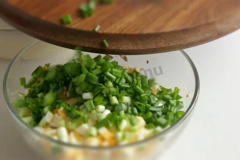 Нарежьте лук и добавьте к рыбе и яйцу.