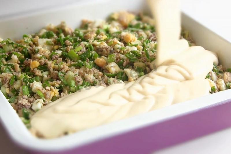 Вылейте половину теста в смазанную маслом форму.