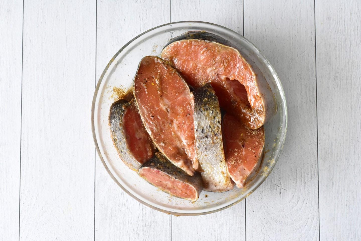 Красную рыбу полейте 1 ст. л. растительного масла, посыпьте специями для рыбы, солью и перцем. Оставьте мариноваться на 20 минут. Если у вас целый кусок рыбы, удобнее всего нарезать его стейками или порционными филе в полузамороженном состоянии. Как приготовить вкусную и сочную рыбу и какие приправы и специи подобрать, читайте в статьях на эти темы. Ссылки в конце рецепта.